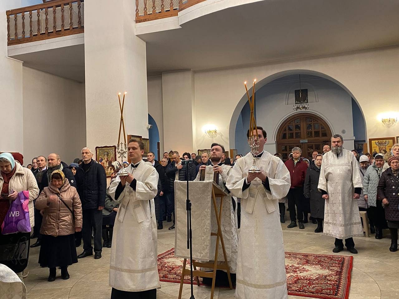 Его Преосвященству сослужили:протоиерей Анатолий Кожа, благочинный Параскево-Пятницкого округа города Москвы, иерей Николай Головинов, настоятель храма Введения во храм Пресвятой Богородицы в Черневе, духовенство вышеозначенного храма.