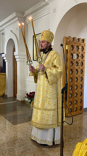Его Преосвященству сослужили: Благочинный Параскево-Пятницкого церковного округа, настоятель храма Великомученицы Параскевы Пятницы в Качалове города Москвы, протоиерей Анатолий Кожа, настоятель храмового комплекса в честь Владимирской иконы Божией Матери в Южном Бутове протоиерей Сергий Тришкин, клирик храма Владимирской иконы Божией Матери в Южном Бутове иерей Илия Ермаков и клирик храма преподобной Евфросинии Московской в Котловке диакон Константин Бабак.