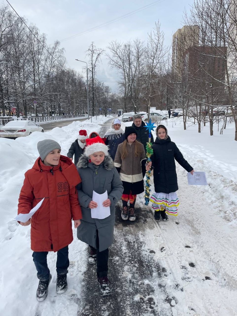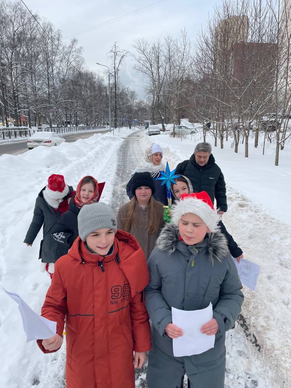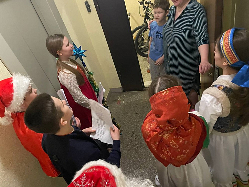 Юные Христославы - учащиеся Воскресной школы «Исток» с родителями отправились в соседние дома поздравлять прихожан храма и всех людей с Праздником.