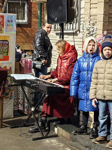 Началось выступление с пения тропаря Пасхи Господней и продолжили концерт учащиеся младшей группы «Зёрнышки»: детки прочитали стихи, спели песни под аккомпанементом аккордеона, в исполнении директора Воскресной школы Гришиной Екатерины Вадимовны.