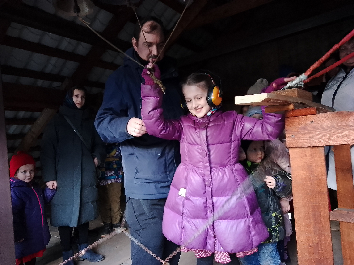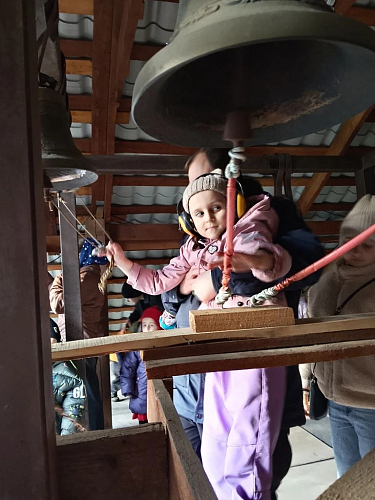 Затем ведущий показал технику колокольного звона и несколько основных видов перезвона. Каждый из участников попробовал ударить в колокола и с помощью ведущего исполнить пасхальный перезвон.