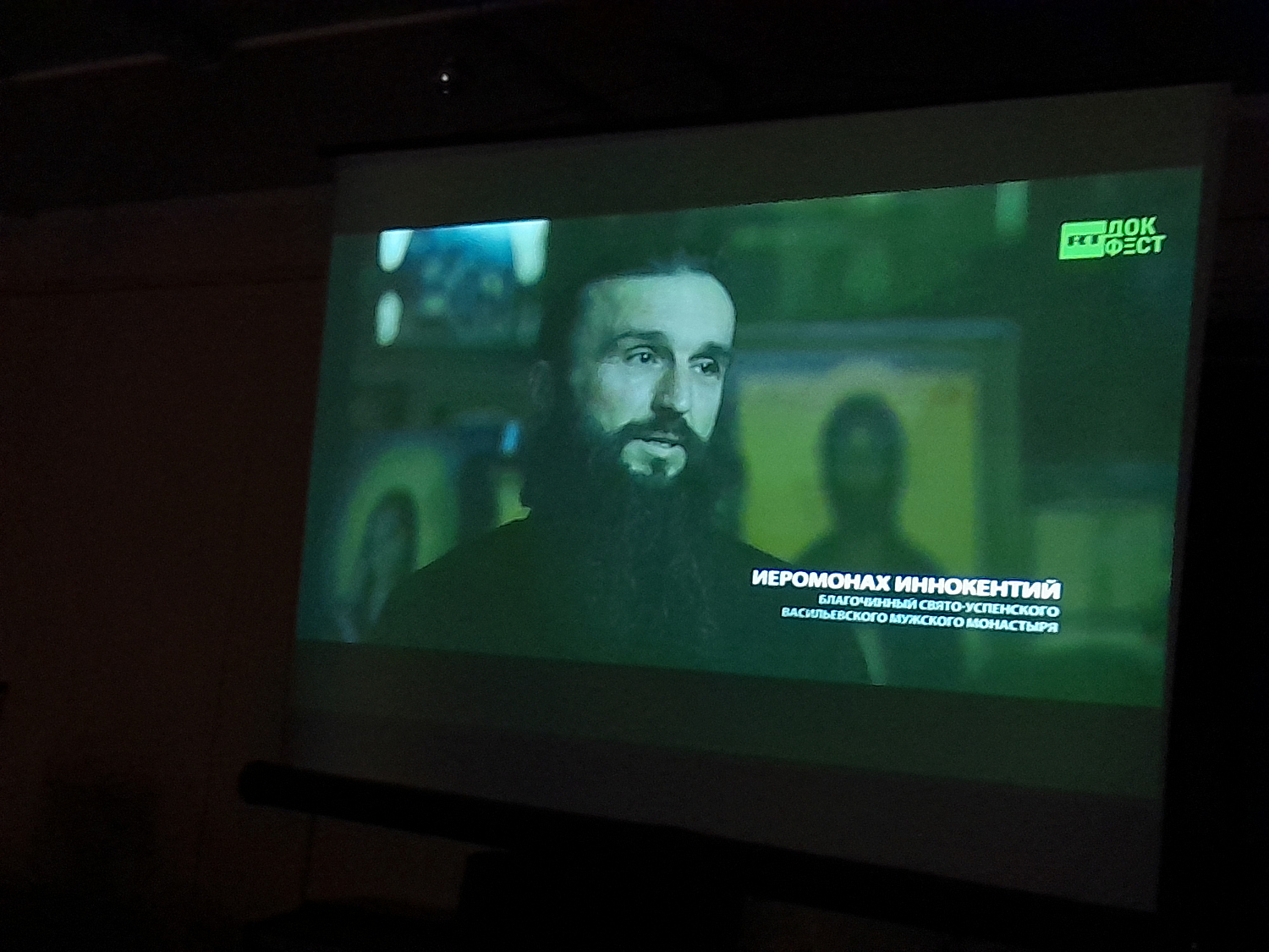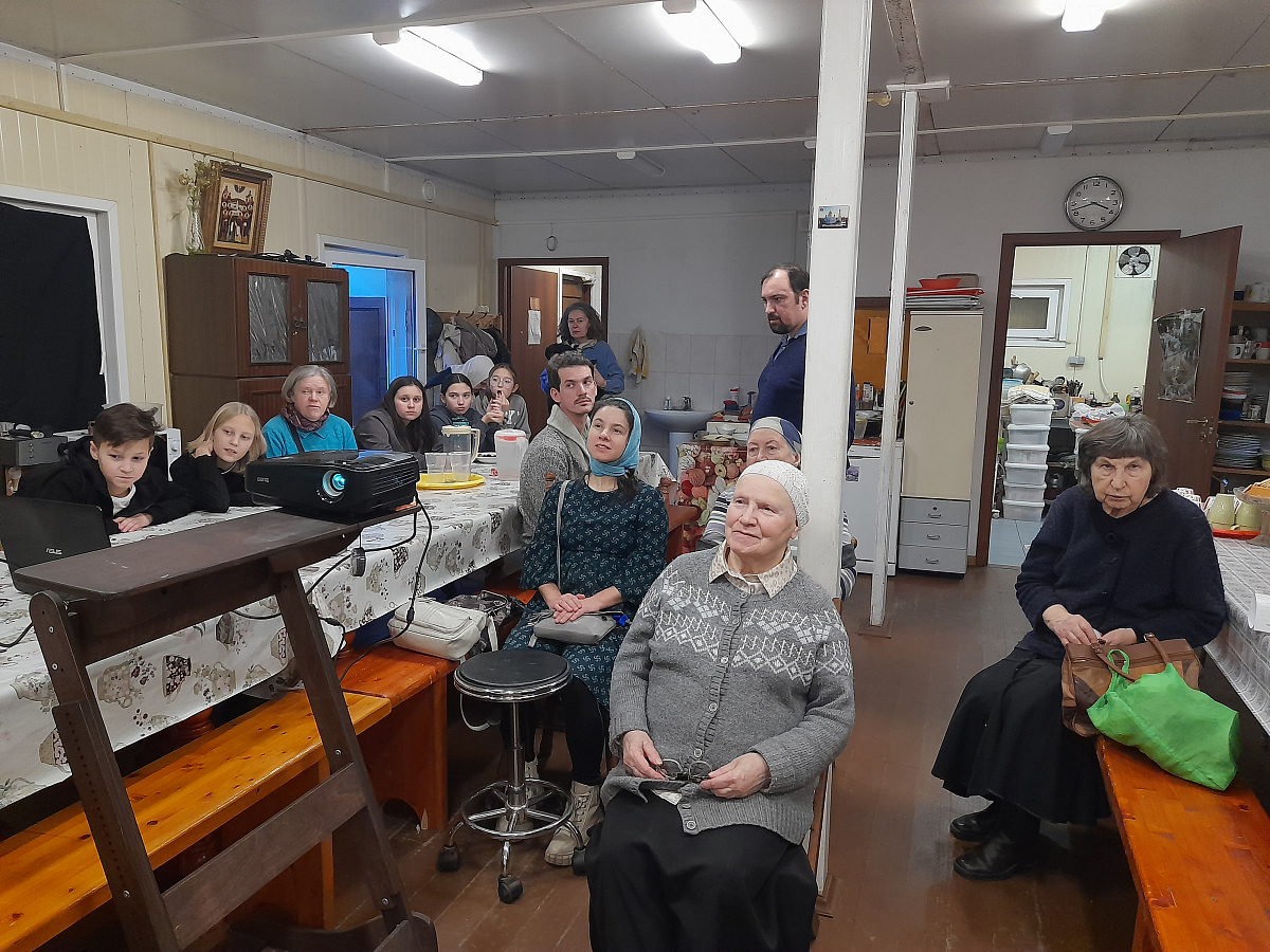 Перед показом ведущий кинолектория, катехизатор храма, Михаил Погорелов вкратце рассказал о Свято-Успенском Николо-Васильевском монастыре села Никольское Донецкой Народной Республики, который находится в центре военных действий, ведущихся в зоне СВО.