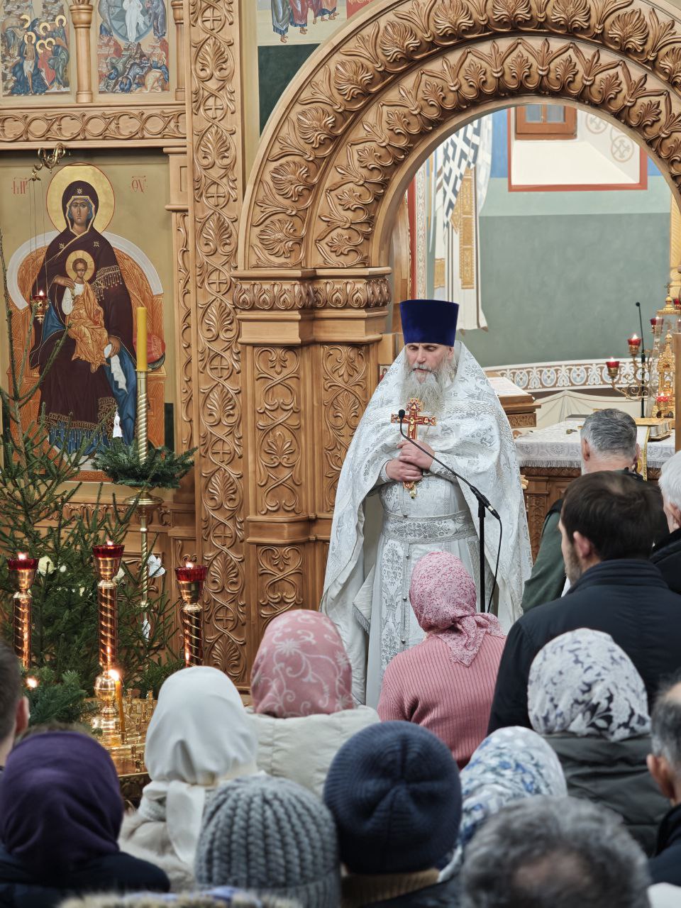 Всех гостей и прихожан встречал вертеп с Рождественской иконой, разместившийся перед крыльцом, в самом же центре храма по традиции — икона со сценой рождения Спасителя.