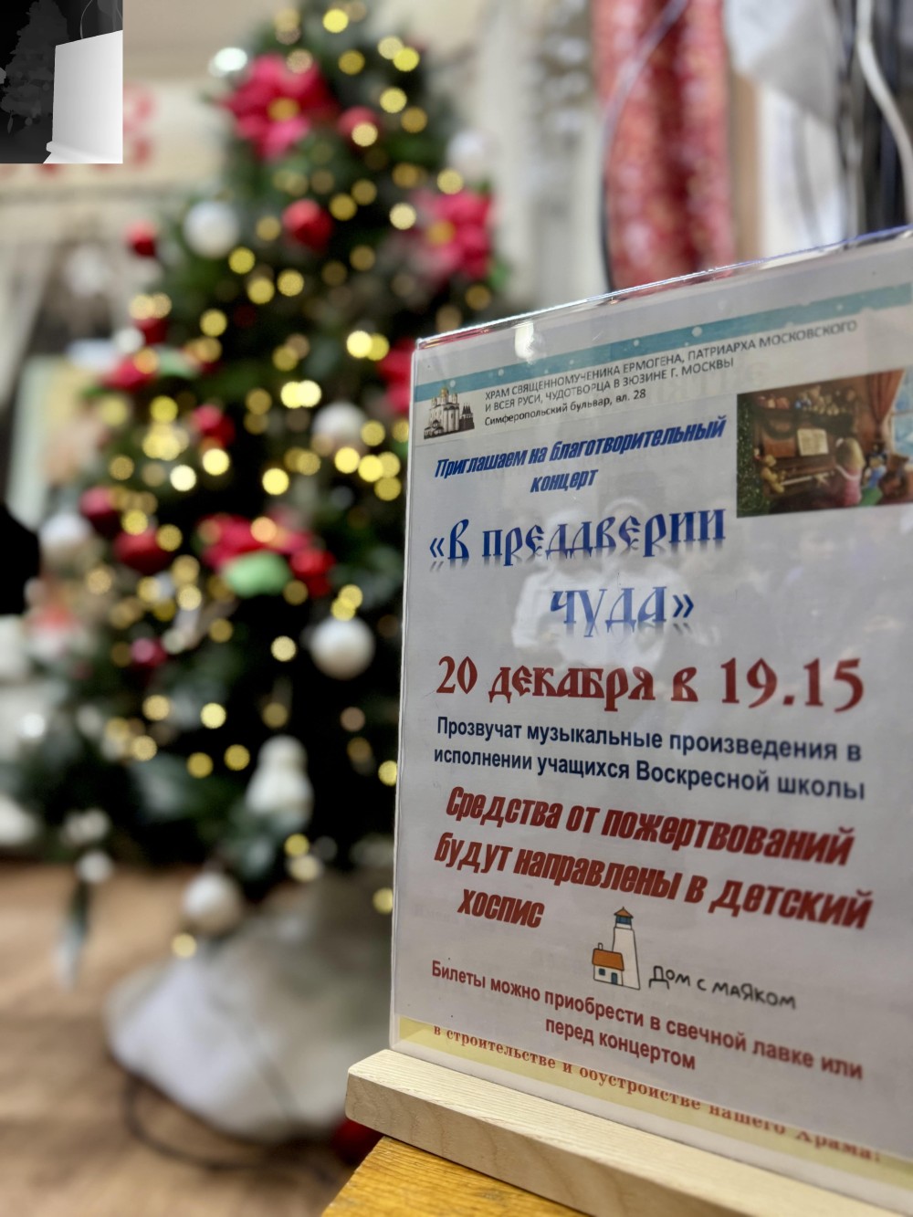 20 декабря 2025 года, в Воскресной школе «Исток» храма Священномученика Ермогена в Зюзине состоялся благотворительный концерт «В преддверии чуда», в котором выступили дети, обучающиеся в музыкальных школах и студиях.