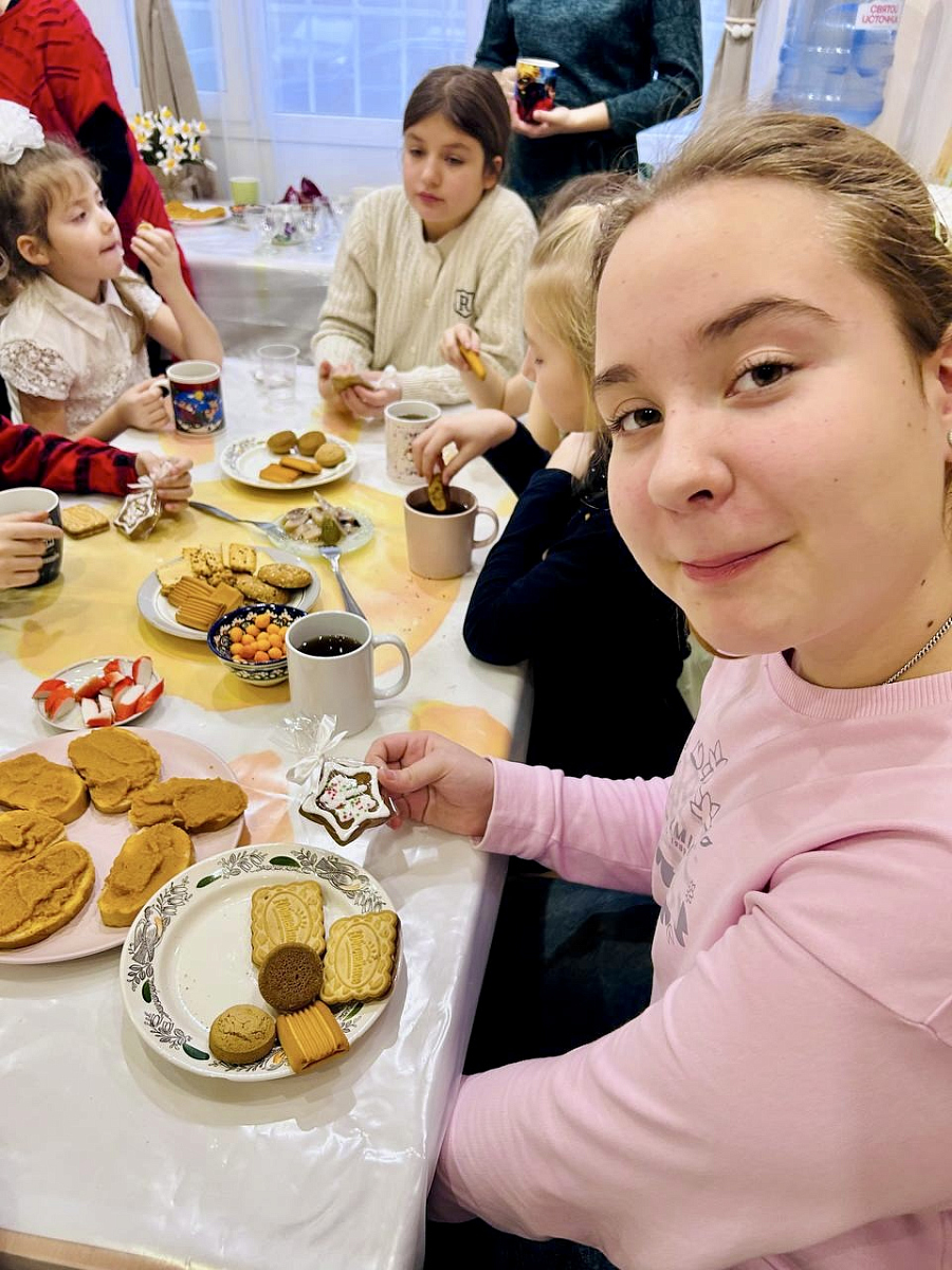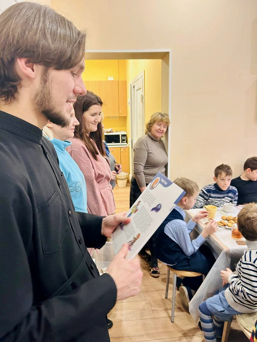 Преподаватель Воскресной школы диакон Никита Павлушенко рассказал ученикам о жизни святителей, а в конце мероприятия преподнес всем присутствующим сладкие подарки.