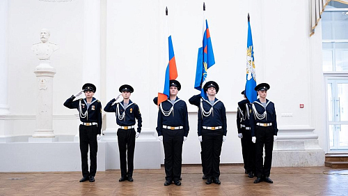 Затем прозвучала команда начальника отдела строевой и воспитательной работы Терентьева Ю.А.: «Гюйсы надеть!», — и синхронно форменные воротнички опустились на плечи курсантов.
