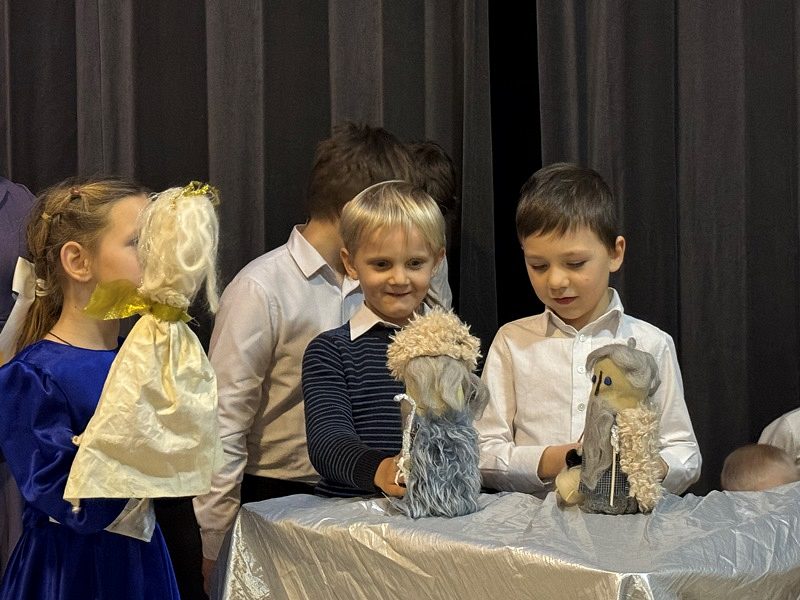 Рождественский спектакль состоял их двух частей. Сначала дети из первых трех классов школы показали небольшой музыкальный кукольный спектакль на тему Рождества Христова в Вифлееме, кукольный вертеп "Смерть царя Ирода". Интересно, что куклы они сделали сами своими руками. Спектакль проходил в стихотворной форме с добавлением различных рождественских песнопений. Маленькие актеры от души исполняли свои роли и сами переживали Евангельские события.