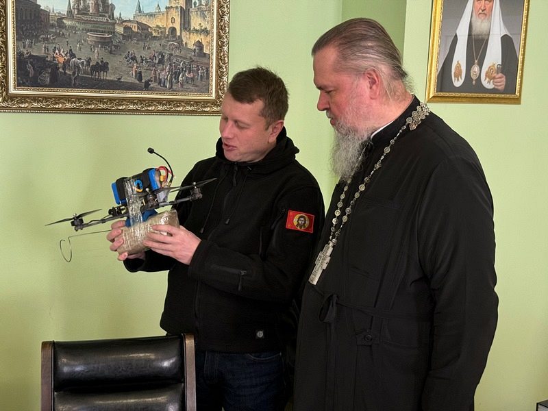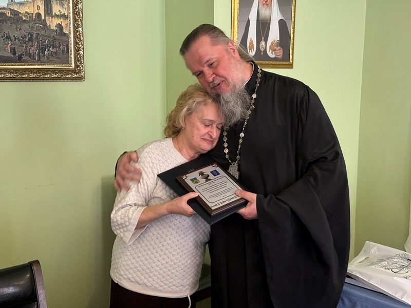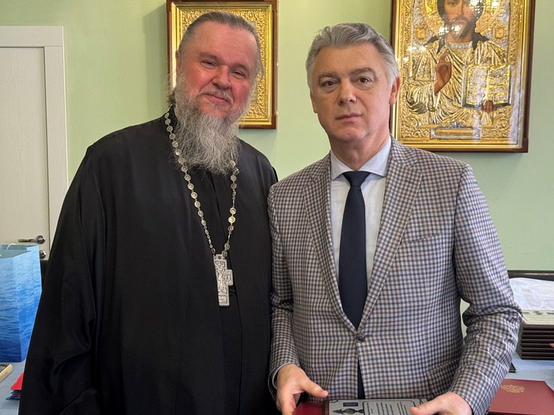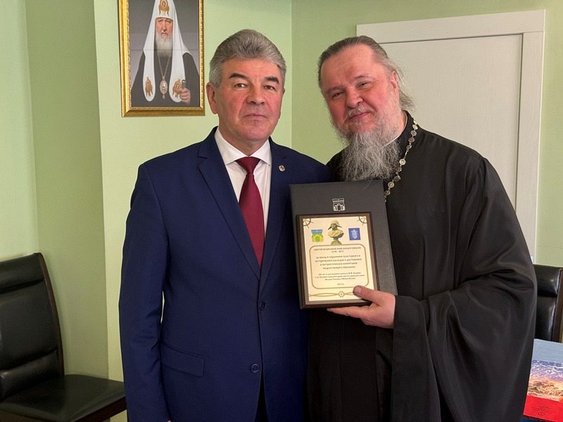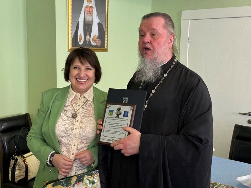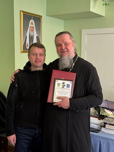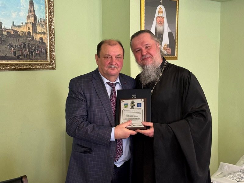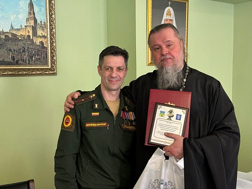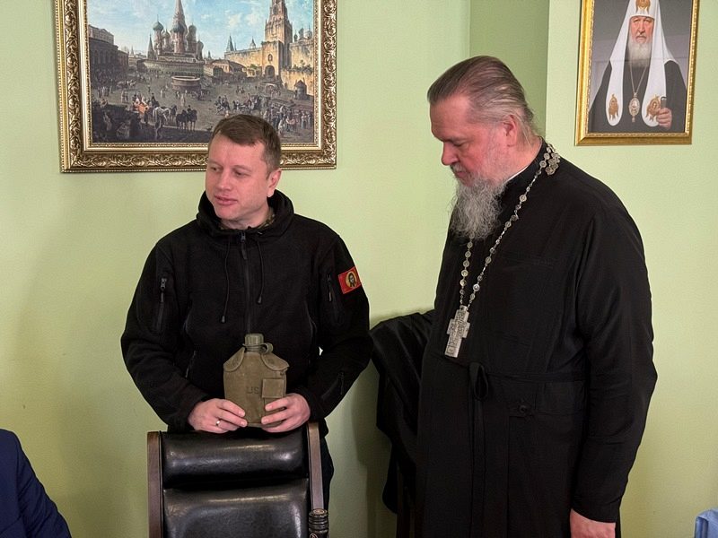 Глава Муниципального округа Южное Бутово Голубцов Павел Викторович поблагодарил настоятеля и госьтей за их труды и пердал в музей Патриаршего подворья несколько ценных исторических экспонатов с линии фронта СВО.