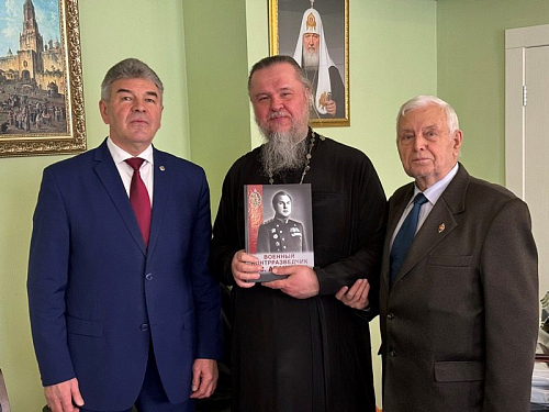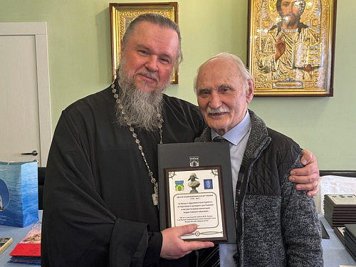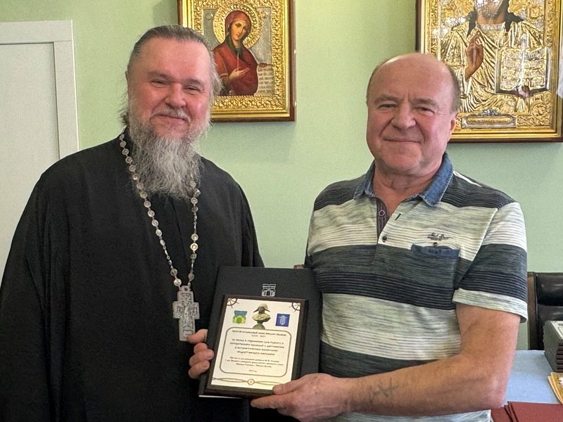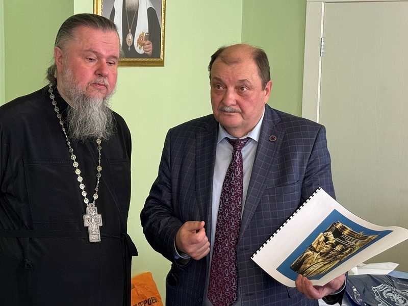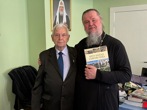 Заместитель директора школы 1161 и Председатель Краеведческого общества Антон Семенович Никулин передал настоятелю замечательные книги по истории Российского флота и краеведению Москвы.