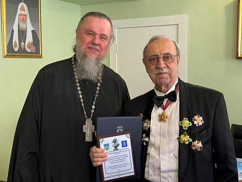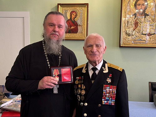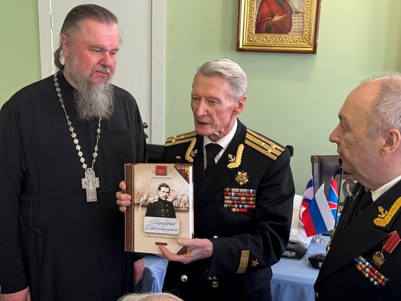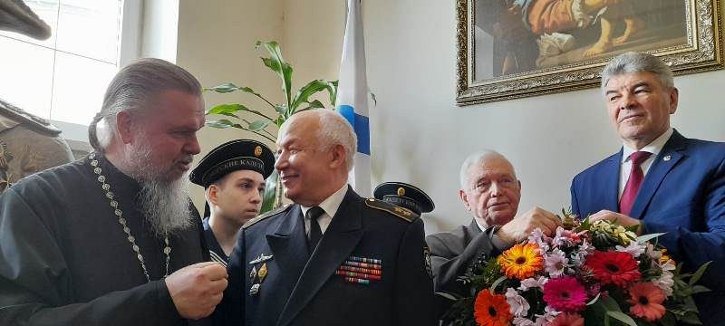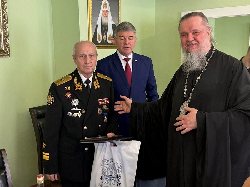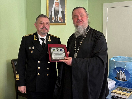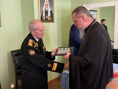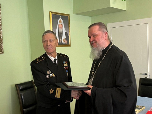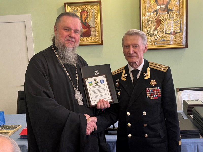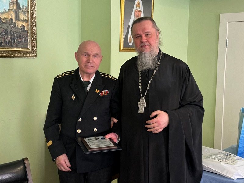 Поздравил настоятеля и прихожан друг храма Святого адмирала председатель Объединённого Совета ветеранов ВМФ Московского Комитета ветеранов войны капитан 1 ранга Валерий Иванович Васильев, который передал Патриаршего подворью интересную литературу про Военно-Морской флот России.