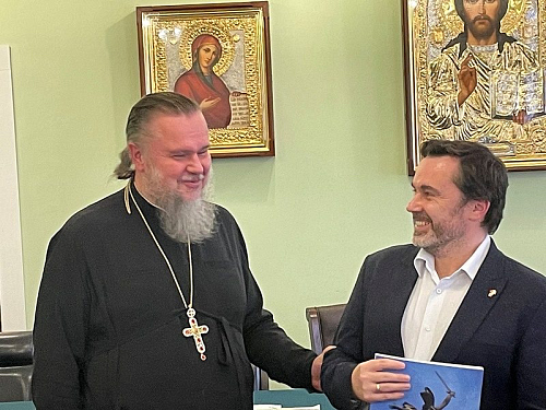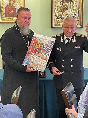 Заместитель директора школы 1161 и Председатель Краеведческого общества Антон Семенович Никулин передал настоятелю специальный альбом Государственной Третьяковской галереи, посвященный памятникам Великой Отечественной войны.