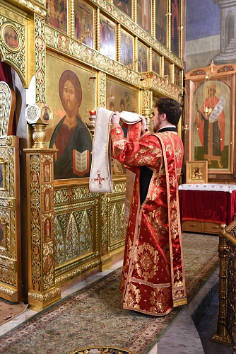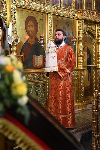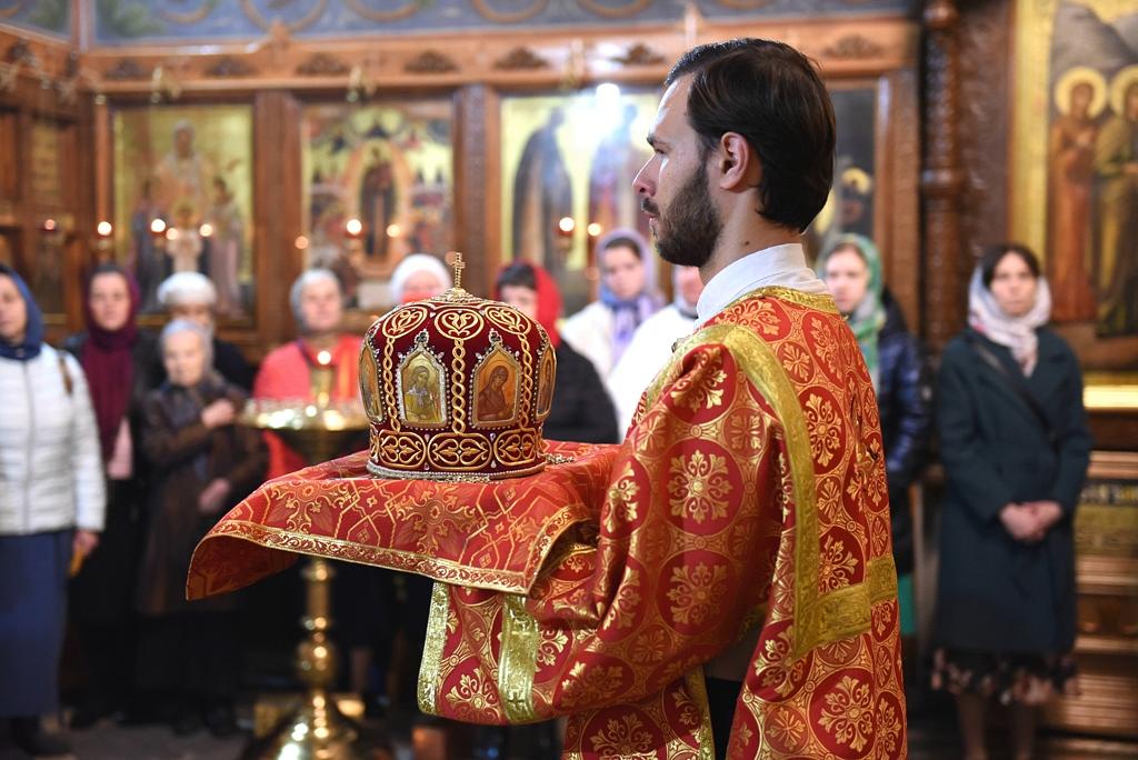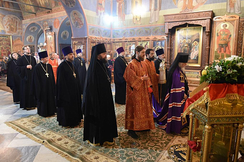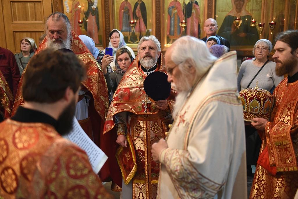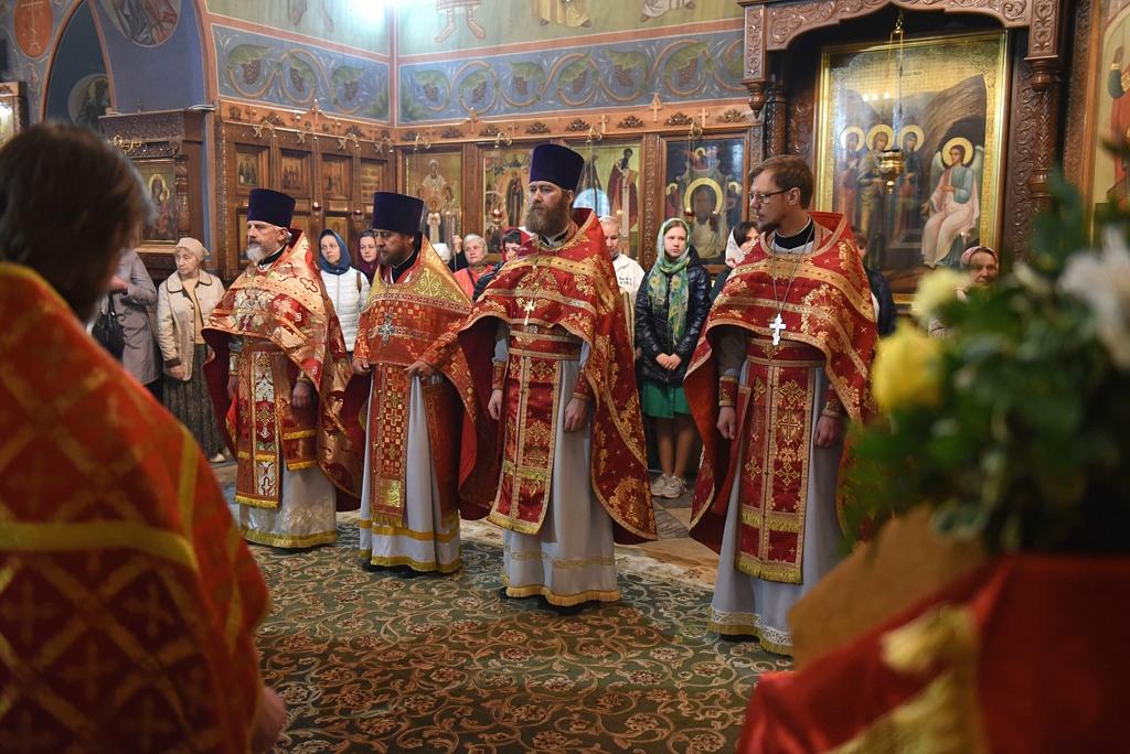 Его Преосвященству сослужили: протоиерей Николай Карасев, благочинный Андреевского церковного округа, настоятель храма Живоначальной Троицы в Старых Черемушках; игумен Дионисий (Шленов), наместник Андреевского ставропигиального мужского монастыря и столичное духовенство.