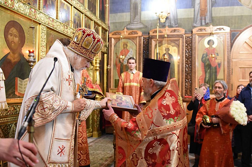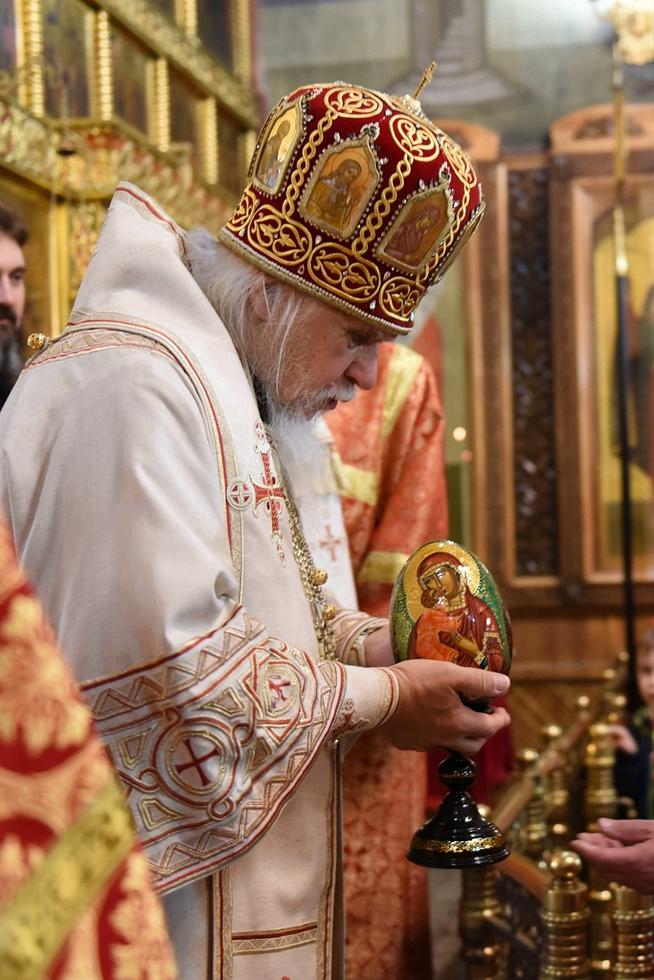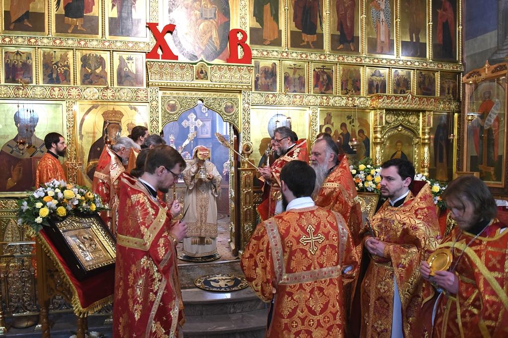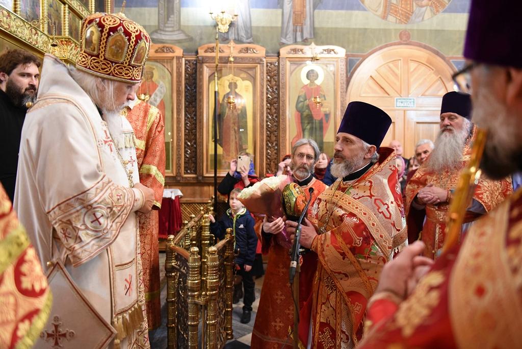 По окончании Богослужения епископ Пантелеимон поздравил с Днем Тезоименитства протоиерея Николая Карасева и преподнес ему в дар образ Пресвятой Богородицы. В ответном слове благочинный поблагодарил управляющего викариатства за возможность соборно помолиться в этот праздничный день и подарил Владыке Пасхальное яйцо с изображением Феодоровской иконы Божией Матери.