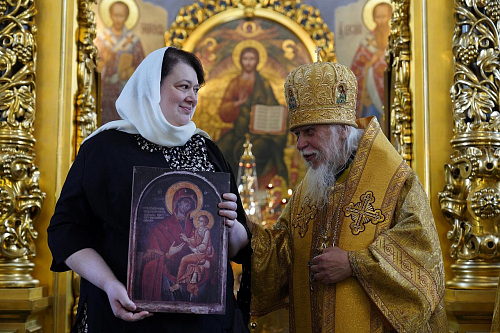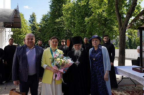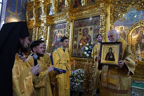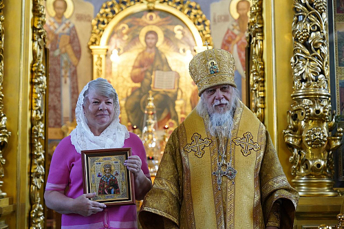 После окончания богослужения настоятель храма архимандрит Алексий (Туриков) поблагодарил владыку за сугубую радость совместной молитвы. В дар Его Преосвященству были преподнесены икона преподобной Евфросинии Московской и панагия.