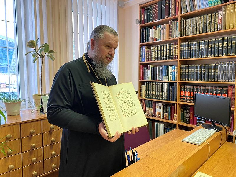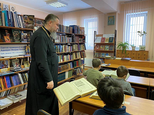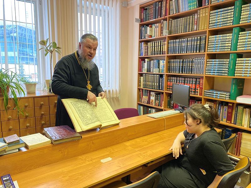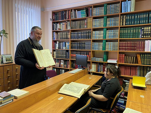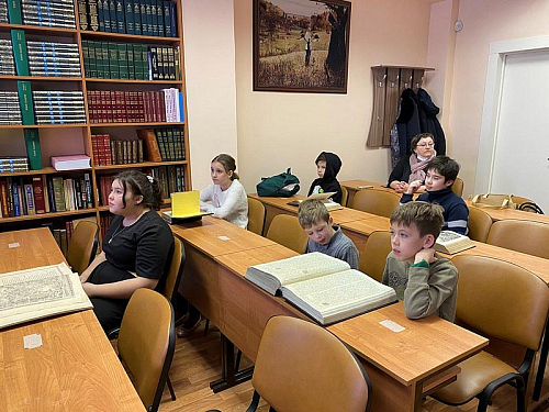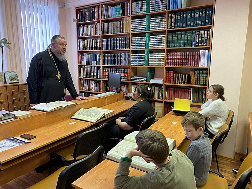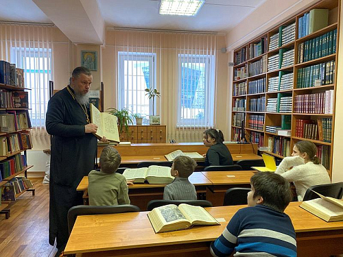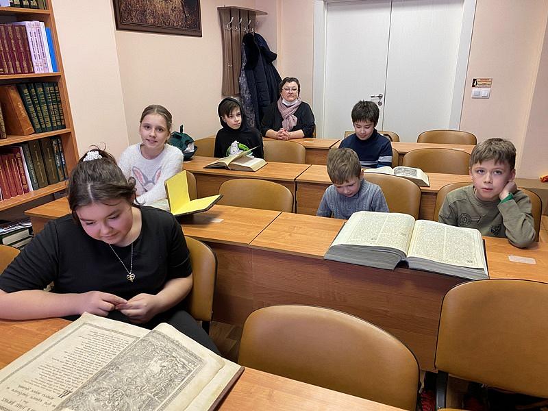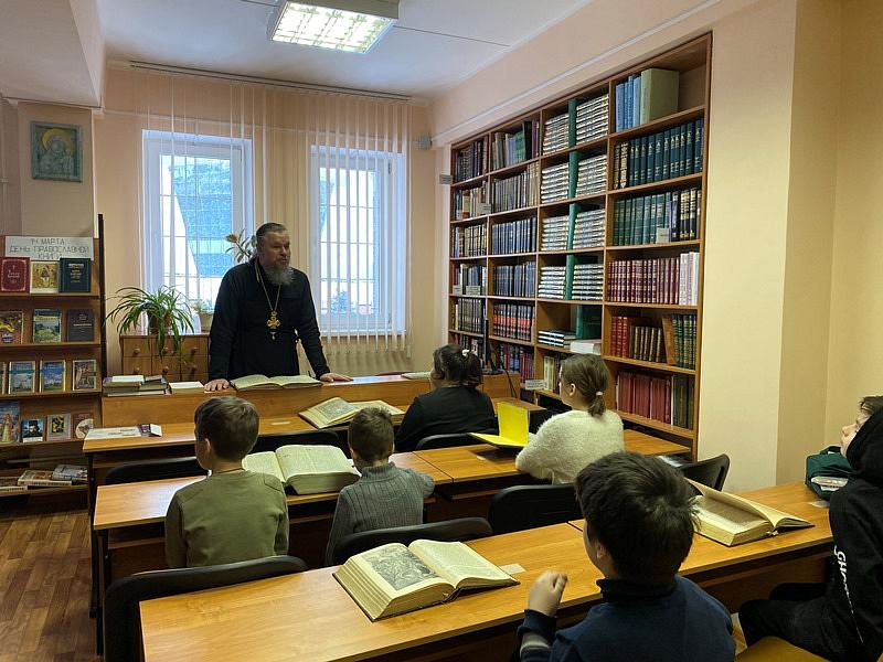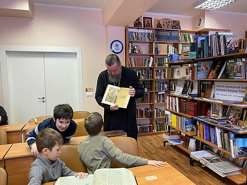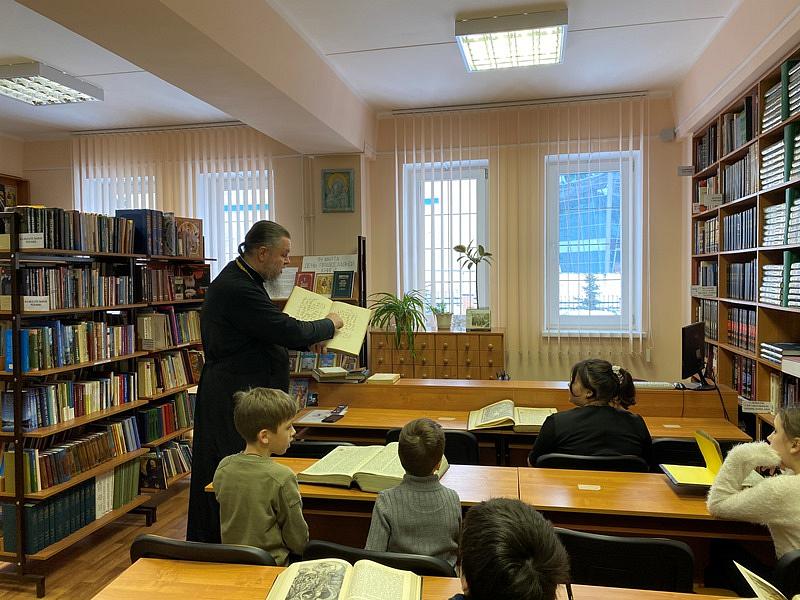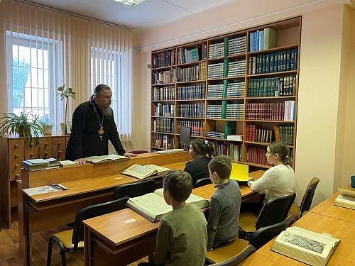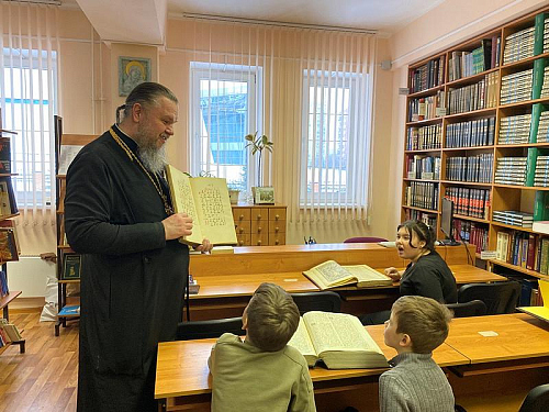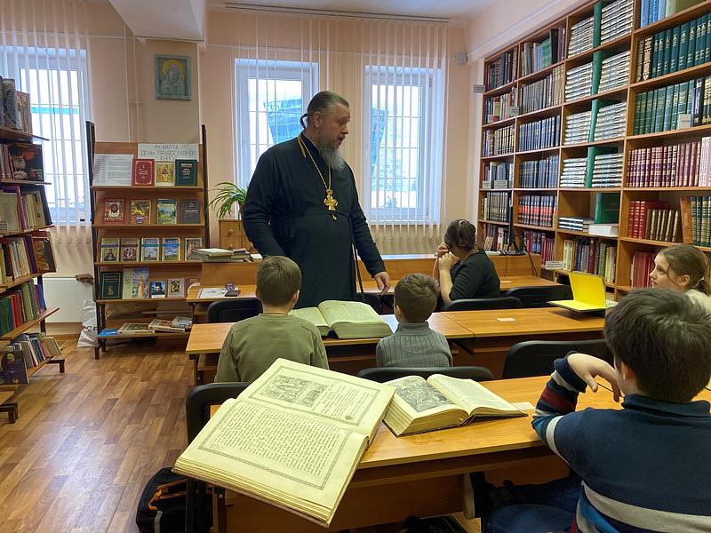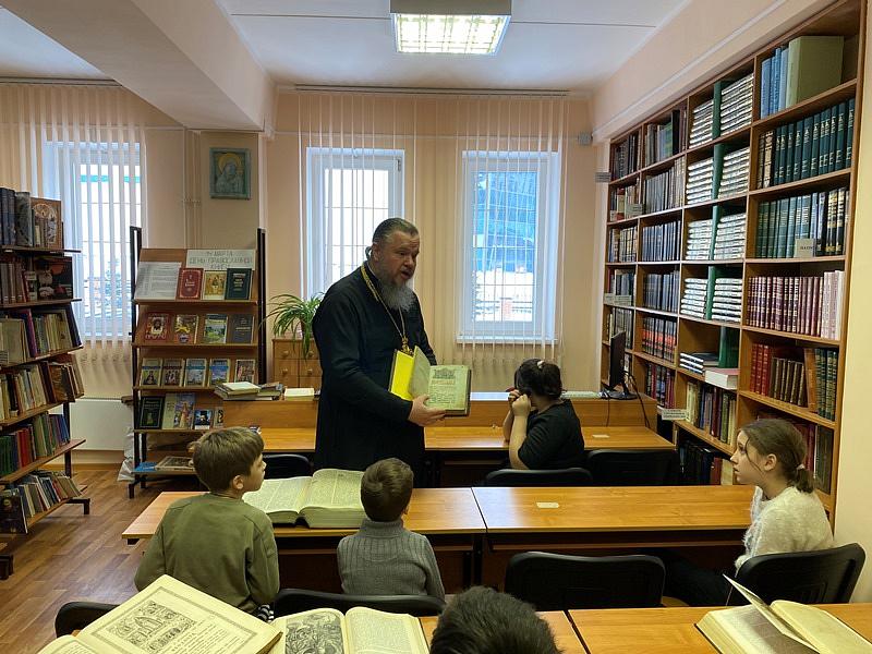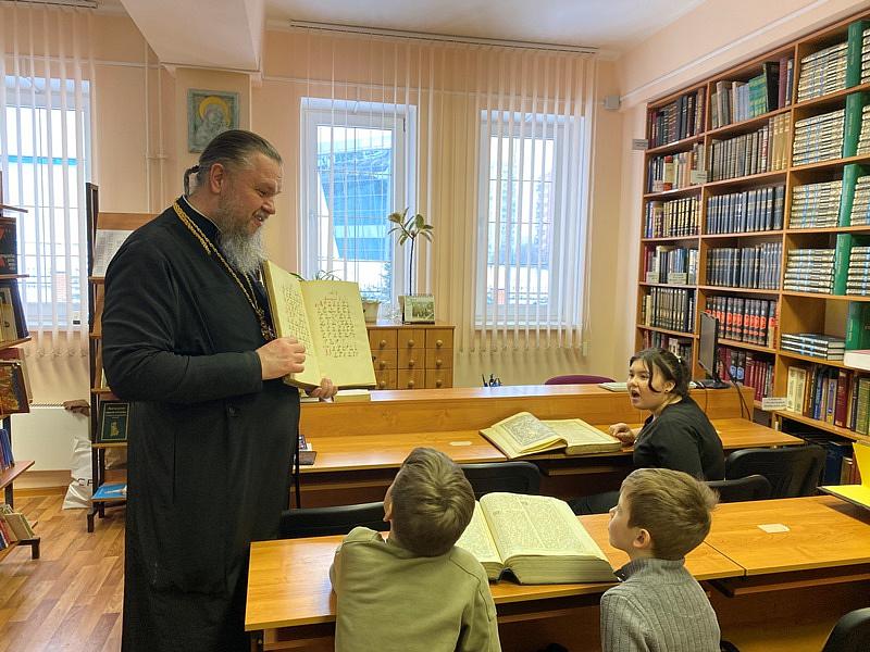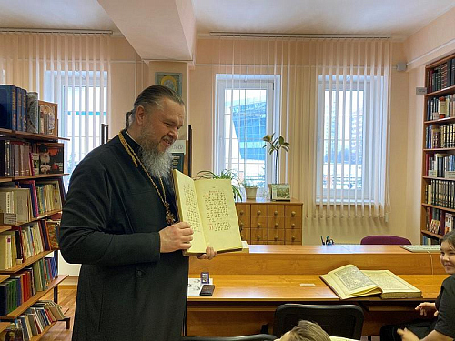 Настоятель Подворья игумен Дамиан (Залетов) провел с учащимися беседу, рассказав детям историю создания первых книг, о первопечатнике – дьяконе Иване Федорове, трудами которого была создана первая книга «Апостол», а также о значении книги в жизни каждого человека. В этом году исполнилось 456 лет со дня издания первопечатной книги.