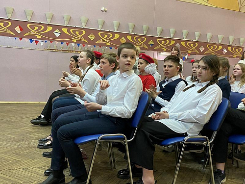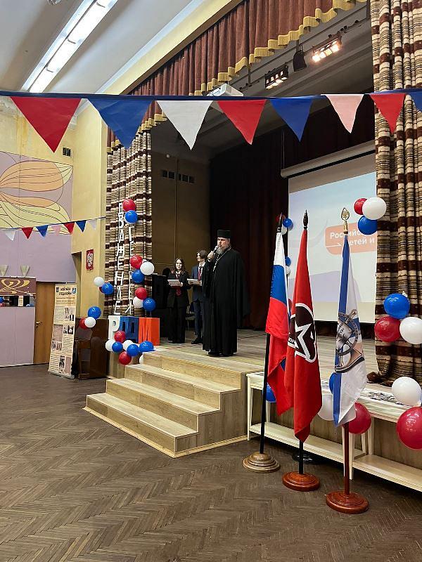 В актовом зале перед участниками мероприятия выступили почетные гости. Со словом приветствия и поздравления выступил настоятель храма игумен Дамиан, который призвал школьникам любить и знать историю России. Он напомнил, что это важное мероприятие в жизни школы проходит накануне Дня Великой Победы, после дня битвы святого князя Александра Невского на Чудском озере и в день 80-летия военной контрразведки СМЕРШ, замечательных героев Великой Отечественной войны.