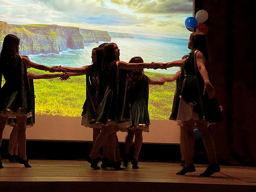 Далее все учащиеся и гости прошли в актовый зал школы, где праздничное мероприятие продолжилось, прозвучали поздравления от гостей и состоялась обширная концертная программа. Игумен Дамиан поприветствовал знаменную группу и группу барабанщиков из школы 1883, с которыми у храма многолетняя дружба и взаимодействие.