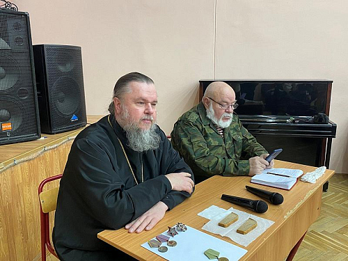 Игумен Дамиан принес и показал ребятам несколько боевых наград Великой Отечественный войны, в том числе знаменитую Медаль за оборону Ленинграда.