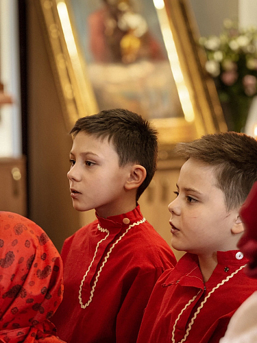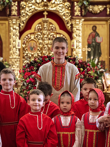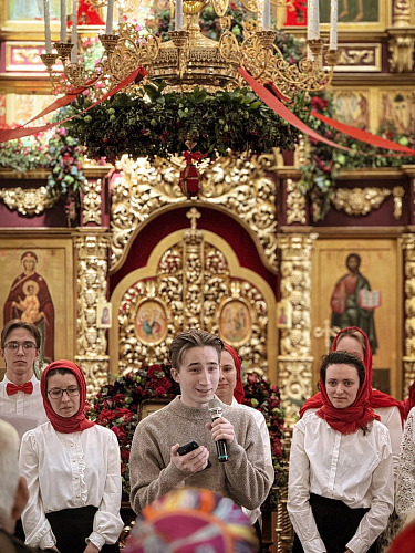 Учащимися были исполнены стих «Христос Воскрес!» автора К.К. Роше, песня «Праздник Пасхи» на музыку Т. Сальниковой, стих «Хвала Воскресшему» авторства великого князя Константина Романова, «Песенка про Ангелов» (муз. Ю. Пастернака, слова К. Пастернак), стих Ивана Бунина «Христос Воскрес!». Затем дети совместно с группой сопрано любительского хора храма (регент Диана Юрьевна Деменкова) исполнили песнопение «Ангел вопияше» Валаамского распева.
