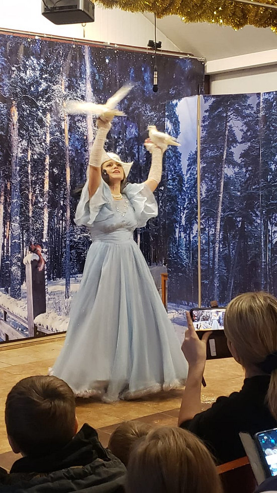 Неожиданным сюрпризом для всех стал номер с живыми голубями и фокусы с животными. На сцене появилась как по волшебству настоящая "фея" в голубом платье с живыми голубями. Под музыку вальса композитора Евгения Доги над зрителями кружили голуби!