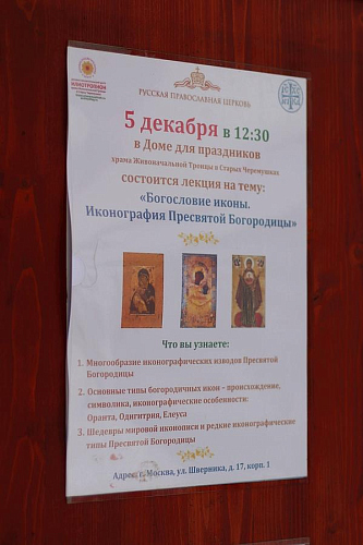 5 декабря 2021 года, в Неделю 24-ю по Пятидесятнице, по благословению благочинного Андреевского церковного округа, настоятеля храма Живоначальной Троицы в Старых Черемушках, протоиерея Николая Карасева в доме для праздников состоялась лекция для прихожан на тему: "Богословие иконы. Иконография Пресвятой Богородицы".