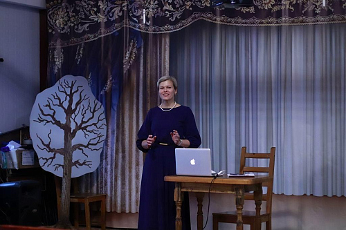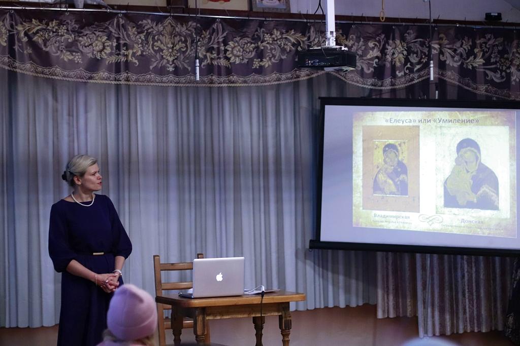 В ходе встречи лектор осветила широкий круг вопросов, связанных с иконографией Пресвятой Богородицы: историю утверждения почитания Пресвятой Богородицы на Третьем Вселенском Соборе 431 года, появления ранних Богородичных изображений, развитие и установление основных иконографических типов Богородицы: Оранта, Одигитрия и Елеуса, а также их взаимосвязь с главными христианскими добродетелями - Верой, Надеждой и Любовью.