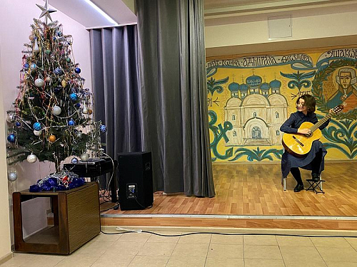 По приглашению настоятеля храма игумена Дамиана (Залетова), ансамбль гитар Детской школы искусств им. В.В. Крайнева и кружка Воскресной школы Патриаршего подворья дал концерт в актовом зале дома причта для гостей, родителей и учащихся.