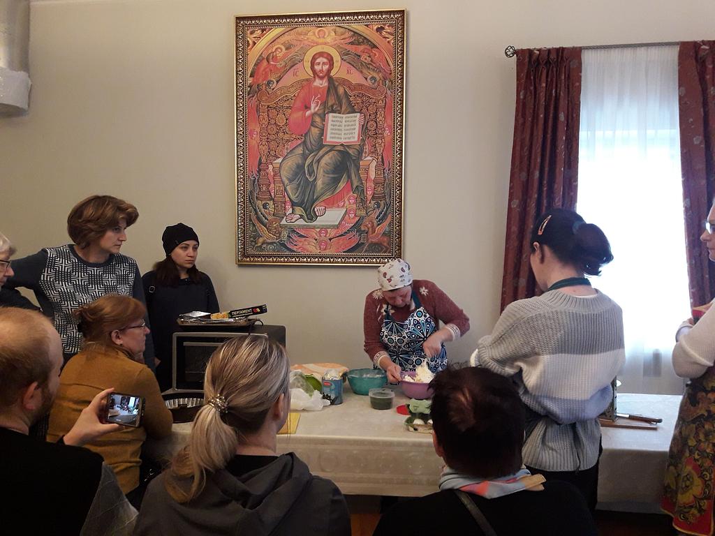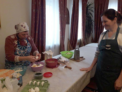 Участники мероприятия (в основном - мамы детей, посещающих Воскресную школу) научились печь национальные пироги с нуля - им были пошагово продемонстрированы все этапы приготовления: от замешивания теста и выбора вариантов начинок до довольно сложного процесса формовки пирогов.