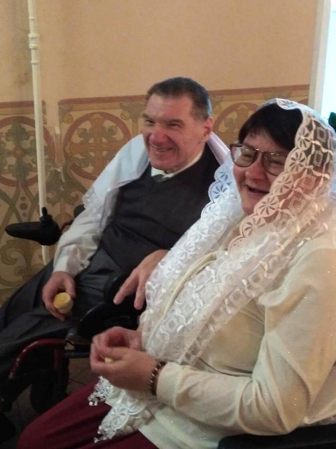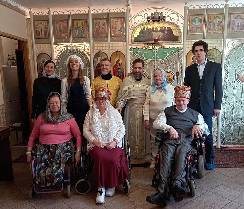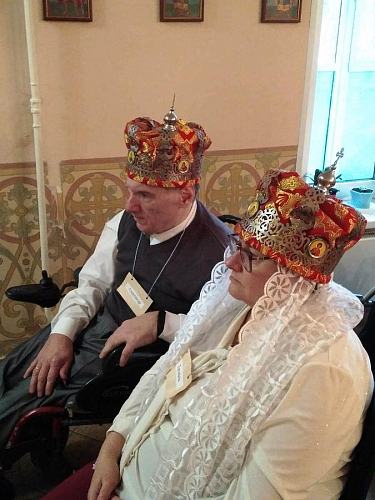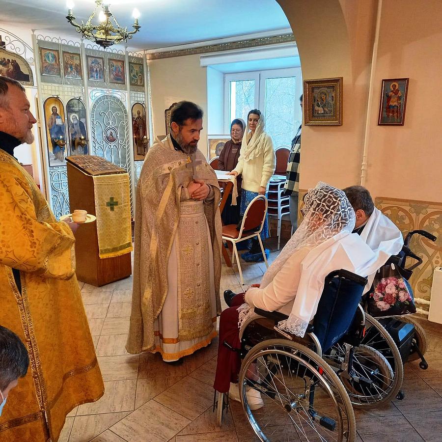 Большой радостью для всех присутствующих было Таинство Венчания для семейной пары, проживающей в пансионате. Настоятель напутствовал брачующихся добрыми пожеланиями и вручил памятные подарки.