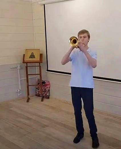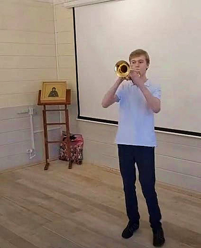 Затем последовали сольные выступления воспитанников Воскресной школы. На фортепиано сыграла Волкова Кристина, а продолжили музыкальную программу игрой на трубе, балалайке и фортепиано братья Волковы – Михаил и Дмитрий.