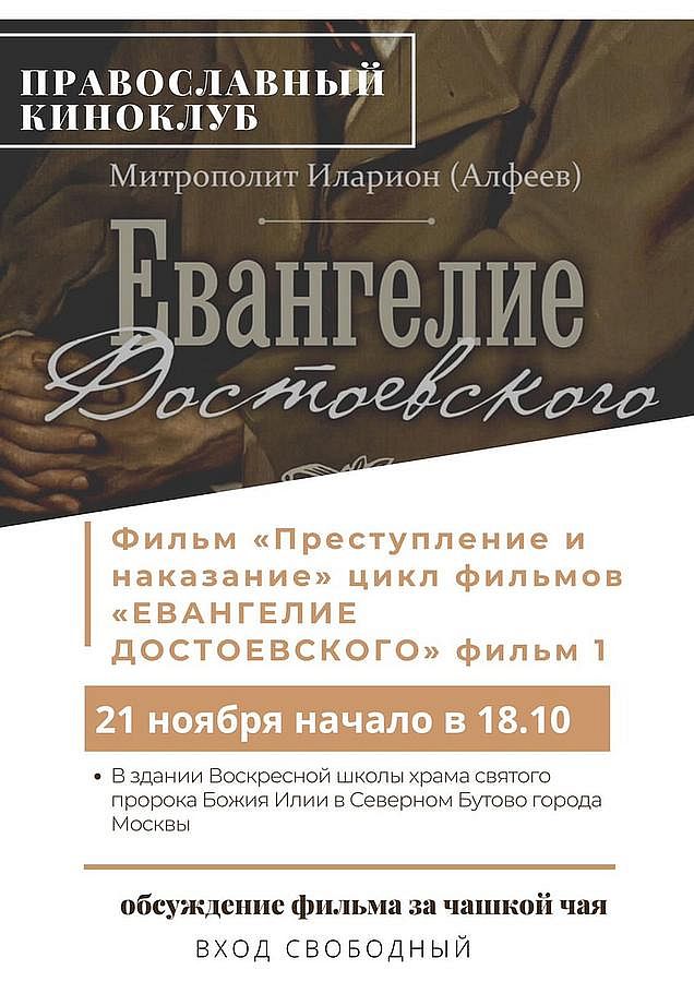 21 ноября 2021 года, в рамках просветительского проекта «Слышать и верить» и приходского кинолектория, в помещении Воскресной школы храма святого пророка Божия Илии в Северном Бутово г. Москвы состоялся кинопоказ фильма «Преступление и наказание» из цикла фильмов митрополита Илариона (Алфеева) «Евангелие Достоевского».