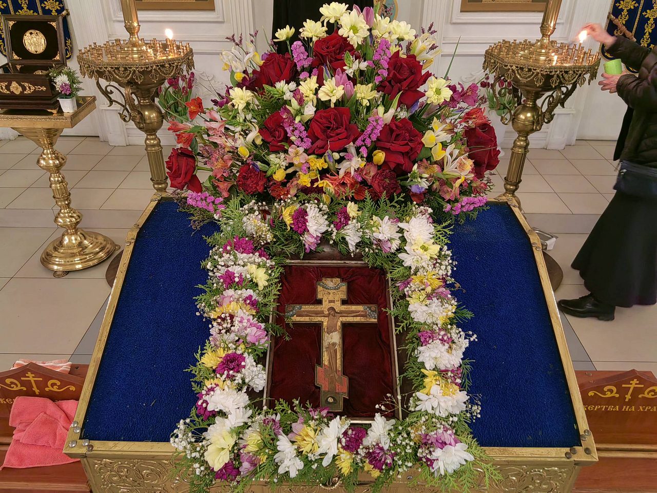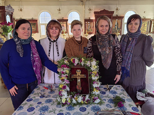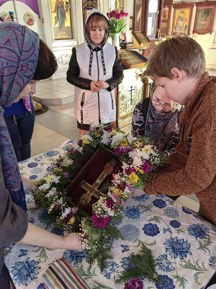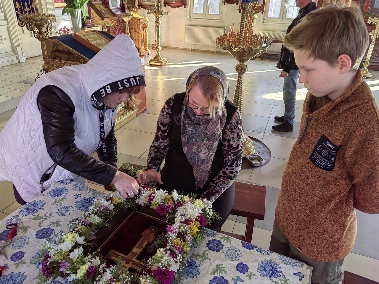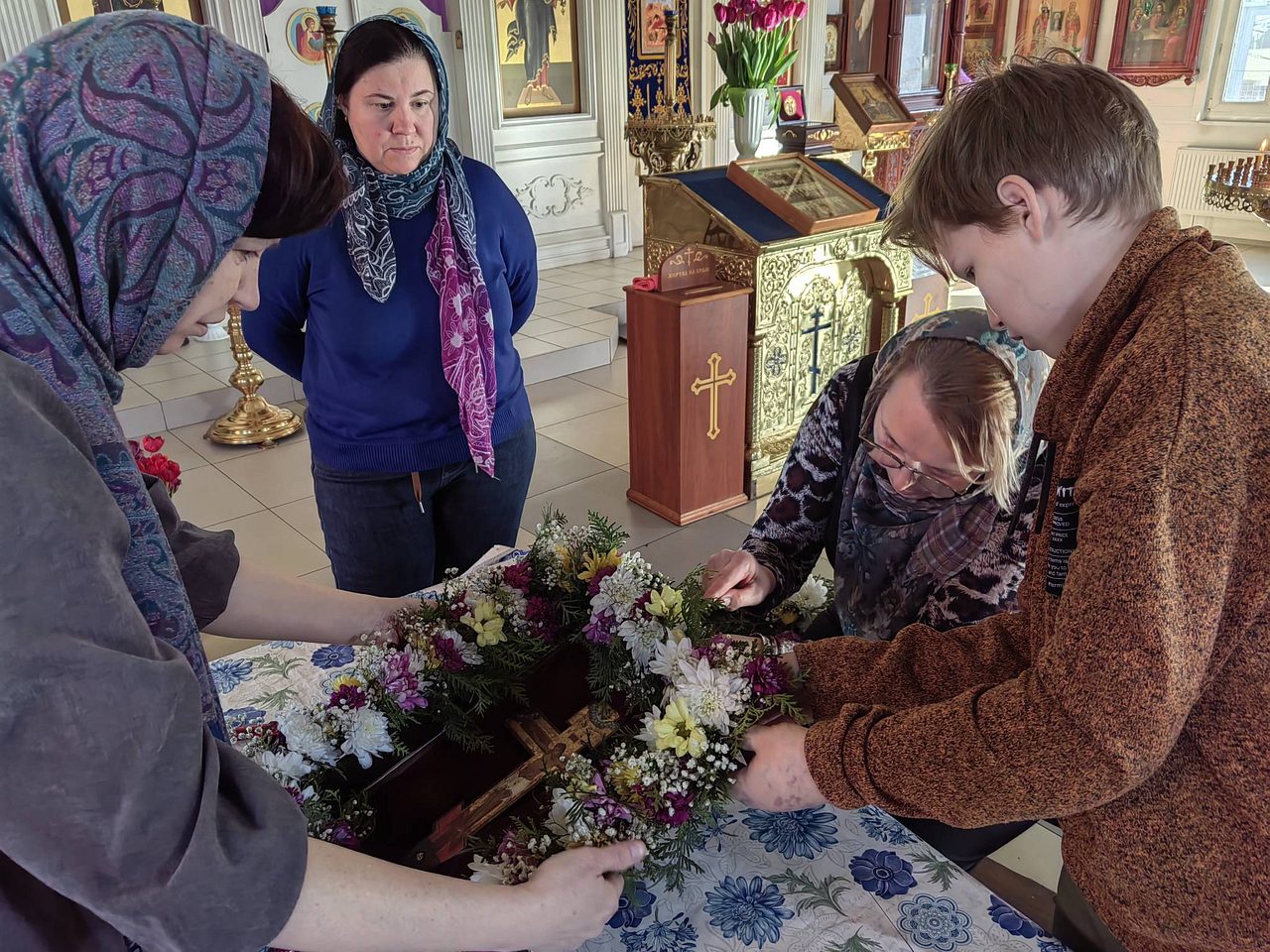Ребята и взрослые украшали крест, который выносят для поклонения верующим в неделю 3-ю Великого поста, Крестопоклонную.