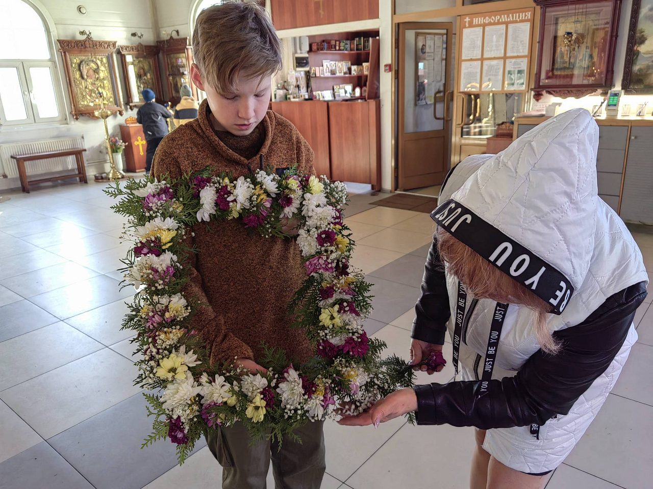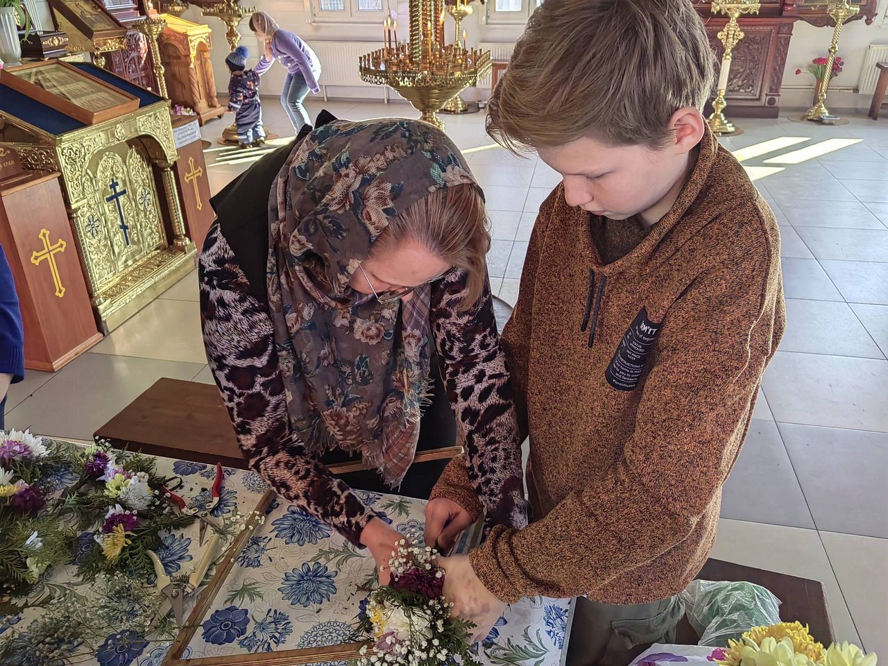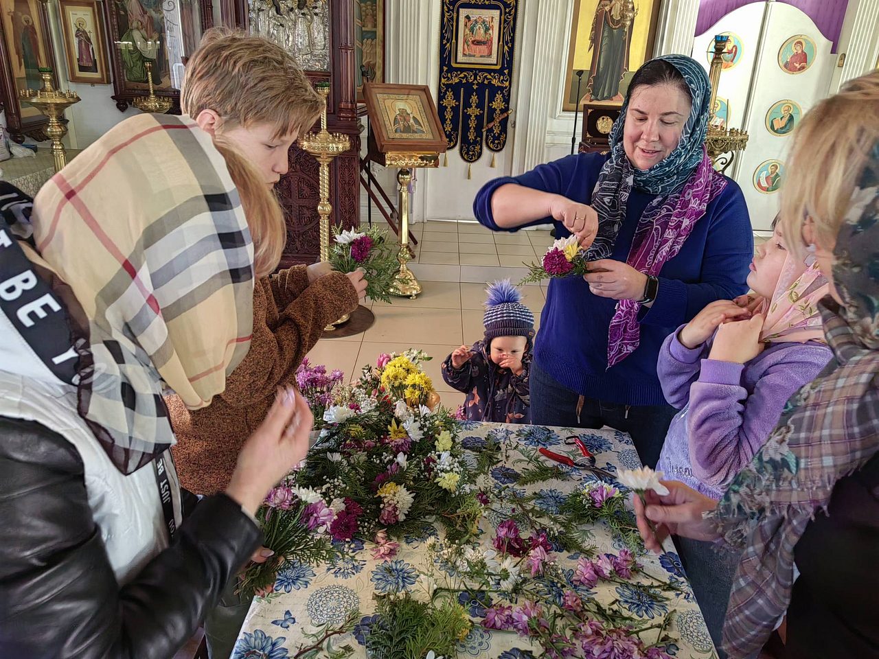 После совместной молитвы, под руководством Хрящевой Натальи, прихожане и и флориста храма ребята с родителями разбирали цветы, учились составлять из них букетики и украшали ими крест.