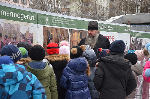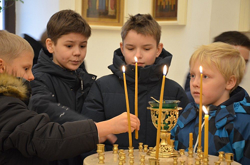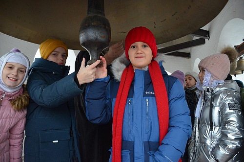 Ребята встретились и познакомились с настоятелем храма иереем Иоанном Омелянчуком, который сначала провел экскурсию по крестильному приделу в честь преподобного Сергия Радонежского, где рассказал детям об устройстве храма, показал купель для совершения Таинства Крещения, затем экскурсия продолжилась в основном храме в честь Патриарха Ермогена, где дети смогли увидеть главные храмовые иконы и другие святыни храма, посмотреть на алтарь, полюбоваться расписанным куполом храма. Большое впечатление произвела на детей колокольня, где иерей Иоанн рассказал о колоколах, после чего каждый смог ударить колокол и услышать его неповторимое звучание. Завершилась экскурсия по храму рассказом настоятеля о молитве. Дети с большим интересом слушали иерея Иоанна, а в завершение каждый смог самостоятельно поставить свечу и помолиться о себе и своих близких.