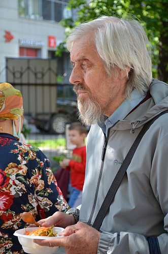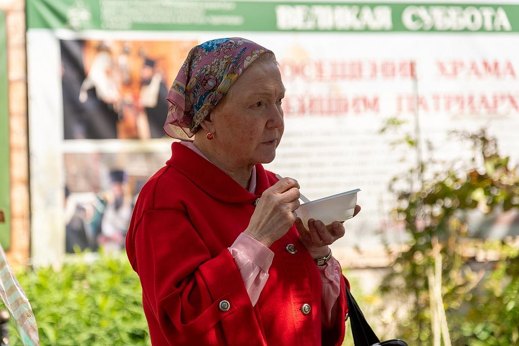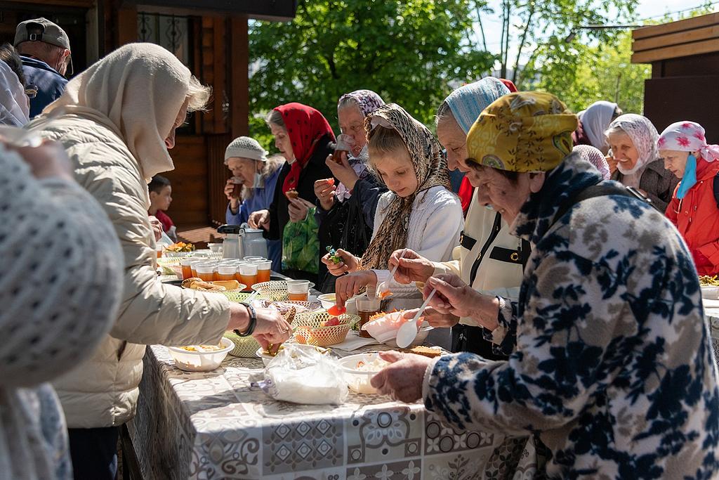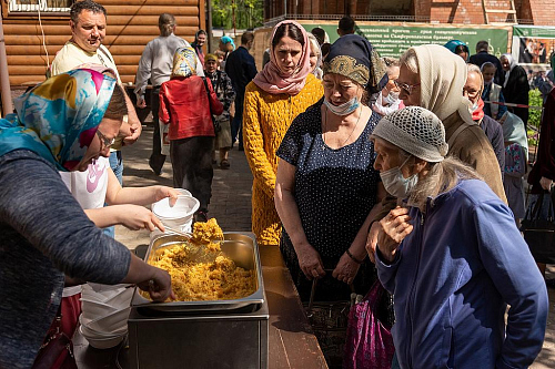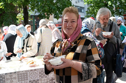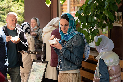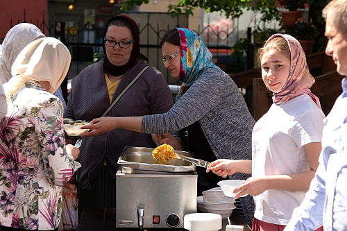 В завершение праздничных Богослужений была организована трапеза - традиционный вкусный плов, приготовленный на полевой кухне, а также ароматный чай со сладостями.