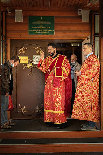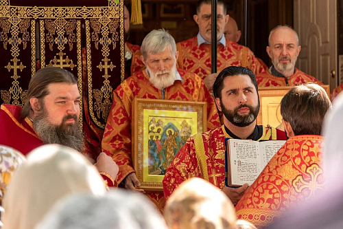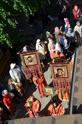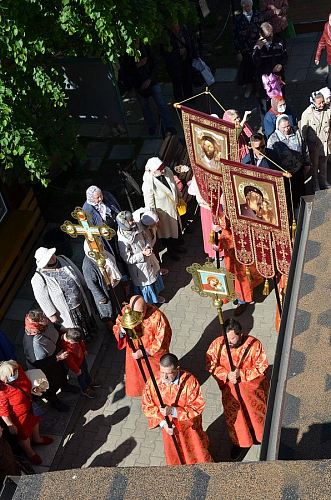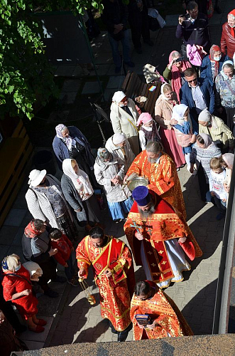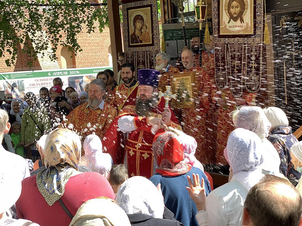 По окончании Божественной Литургии сбыл совершен торжественный Крестный ход с чтением Евангелия и окроплением святой водой,