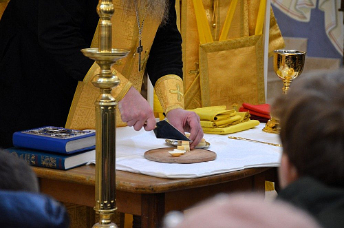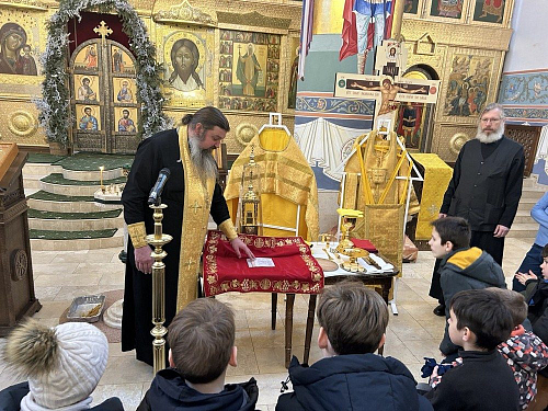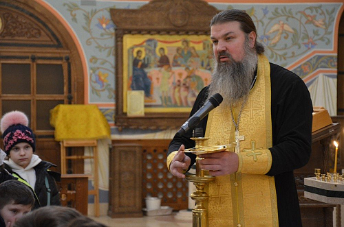 Иерей Иоанн показал Богослужебные предметы алтаря, рассказал о предназначении и символическом значении церковной утвари, а также рассказал о проскомидии, то есть приготовлении Святых Даров к Божественной Литургии и действиях священников во время этой части Литургии.