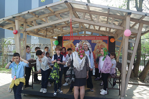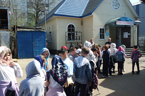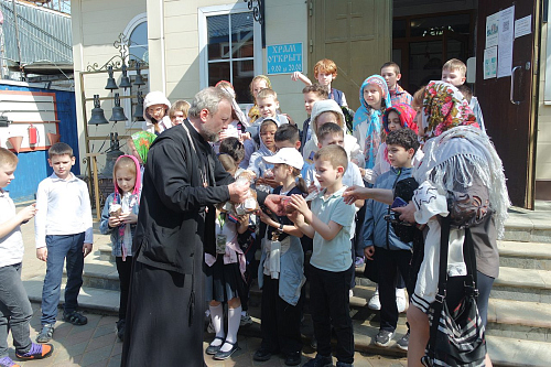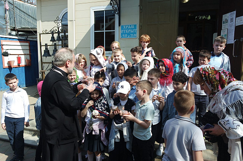 Завершилась экскурсия общей фотографией на память об экскурсии. Настоятель подарил детям пасхальные куличики.