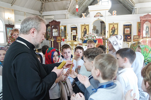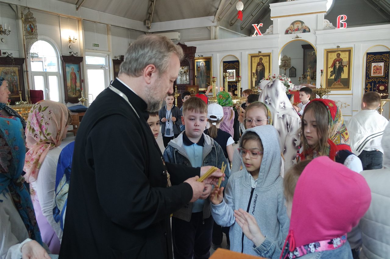 Иерей Максим рассказал детям о Пасхе, Православной вере, о Таинствах Церкви, о святых, изображённых на иконах.
