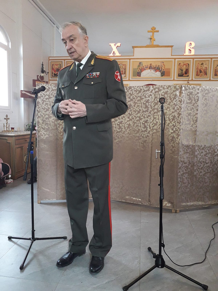 С поздравительной речью к присутствующим обратился участник народного хора генерал-лейтенант, начальник Главного управления международного военного сотрудничества, участник и ветеран боевых действий, награждëнный 4 орденами и 15 медалями, в том числе Орденом Мужества и Медалью Забоевые заслуги Владимир Борисович Фëдоров.