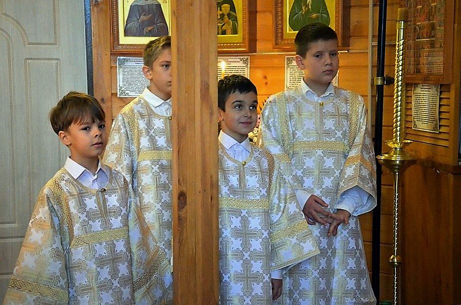 Наиболее отличившиеся за время учебы и посещающие храм воспитанники Воскресной школы в белых стихарях впервые участвовали в Божественной литургии в качестве алтарников, помогали настоятелю в алтаре - подавали кадило, стояли со свечами. Дети готовились к этому событию - накануне несколько часов проведя на занятиях с настоятелем и взрослыми алтарниками, и, не смотря на серьезную ответственность, прекрасно справились с волнением.