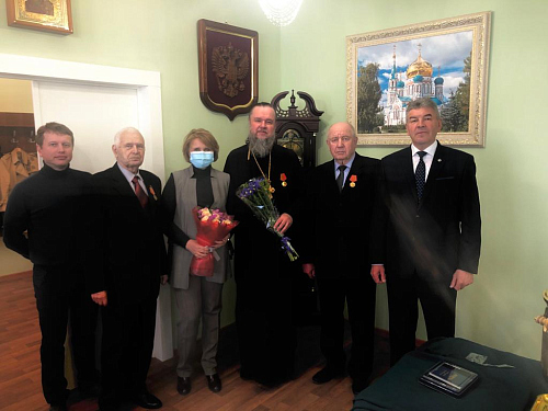 По поручению Совета ветеранов военных контрразведчиков ФСБ России гости вручили настоятелю храма игумену Дамиану (Залетову) памятную медаль: 75-летия Победы над Германией (в честь СМЕРША). Также настоятелю был передан ряд книг по истории Военной контрразведки.