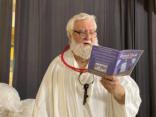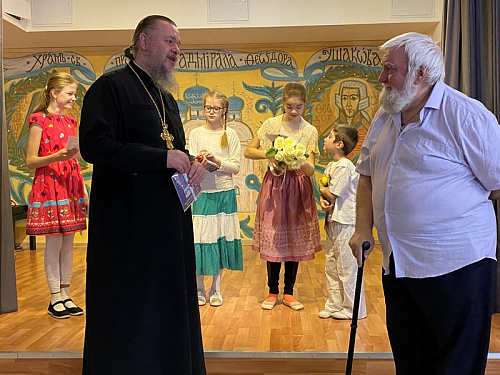 По окончанию спектакля руководитель Театральной студии – Владимир Георгиевич Егоров вручил каждому артисту именную грамоту от храма святого адмирала, а директор Воскресной школы вручила им подарки. Сидящие в зале дети тоже получили Пасхальные подарки.