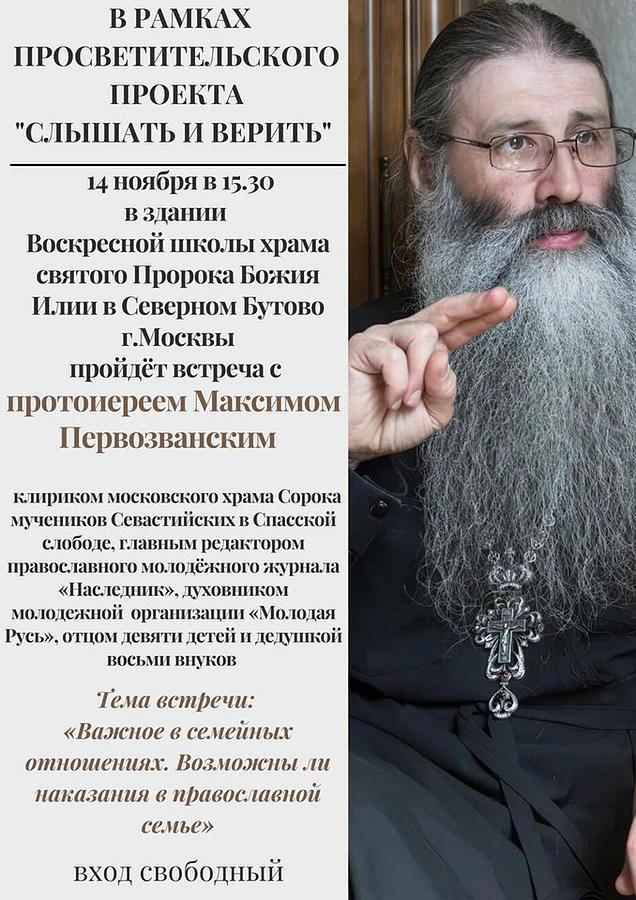 14 ноября 2021 года, в рамках приходского просветительского проекта «Слышать и верить», в здании Воскресной школы храма святого пророка Божия Илии в Северном Бутово г. Москвы прошла встреча с протоиереем Максимом Первозванским, клириком храма Сорока мучеников Севастийских в Спасской слободе, главным редактором православного молодёжного журнала «Наследник», духовником молодежной организации «Молодая Русь», известным миссионером и проповедником.