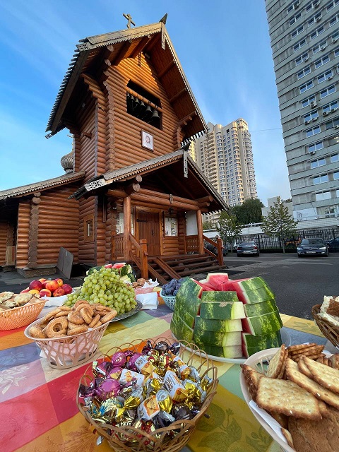 В этот праздничный вечер в церковной ограде было приготовлено угощение: чай, выпечка, сочные фрукты. Особый акцент трапезе придавало традиционное грузинское блюдо из фасоли – лобио.