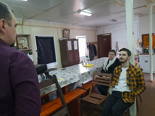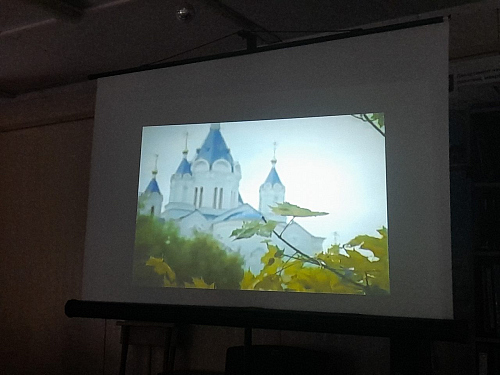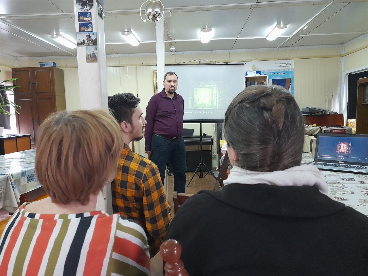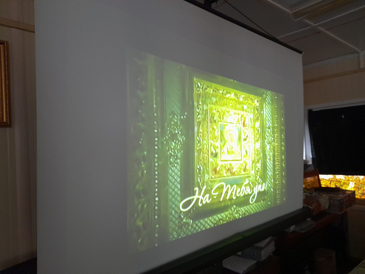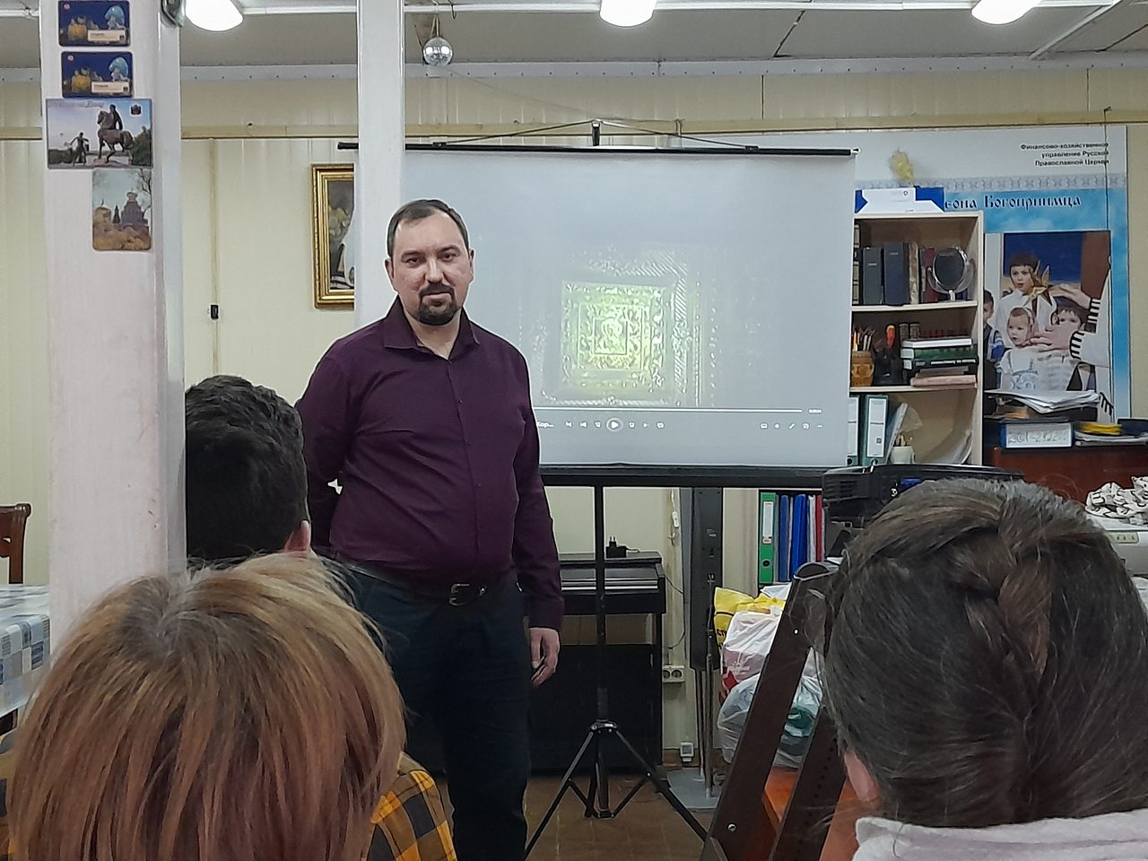 Перед показом ведущий кинолектория, катехизатор храма, Михаил Погорелов вкратце рассказал о чудотворном образе Божией Матери «Знамение» Курско-Коренном.