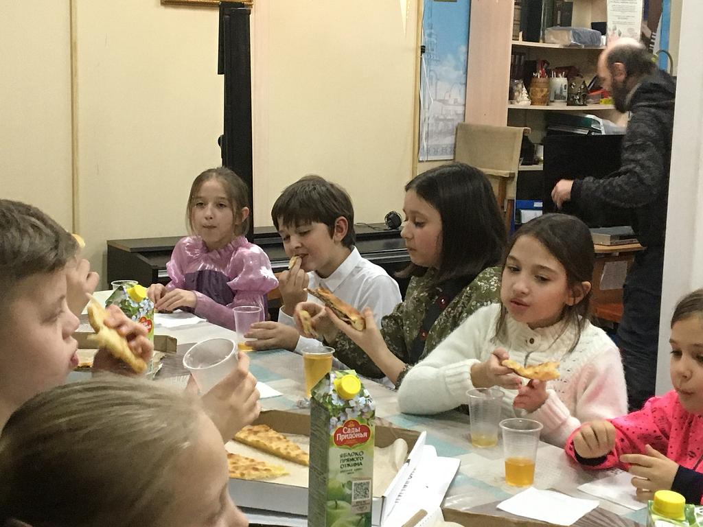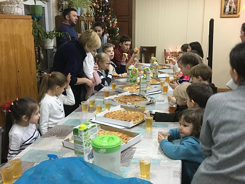 По окончании концерта детей ждал праздничный стол с пирогами и рождественскими подарками.