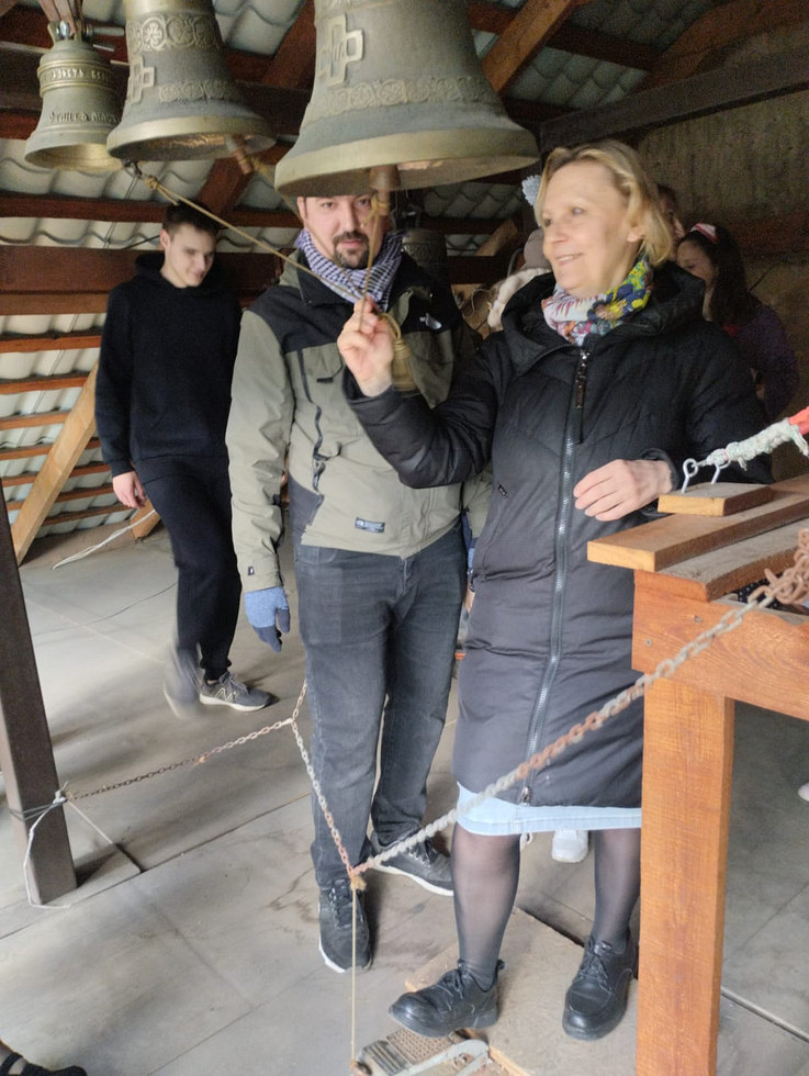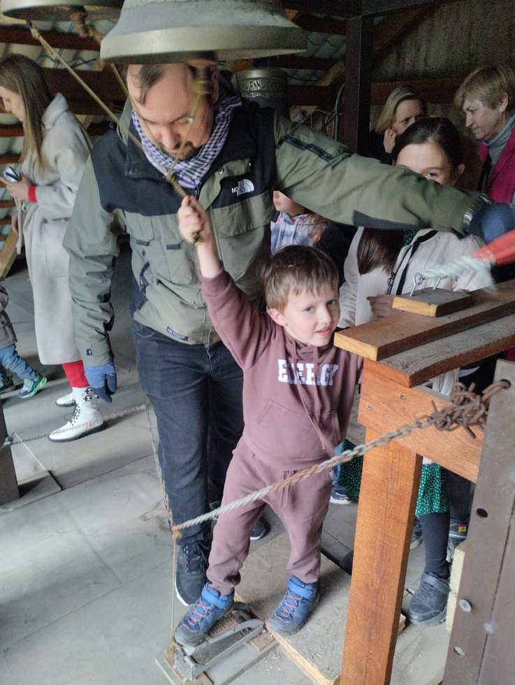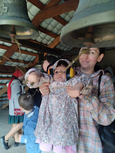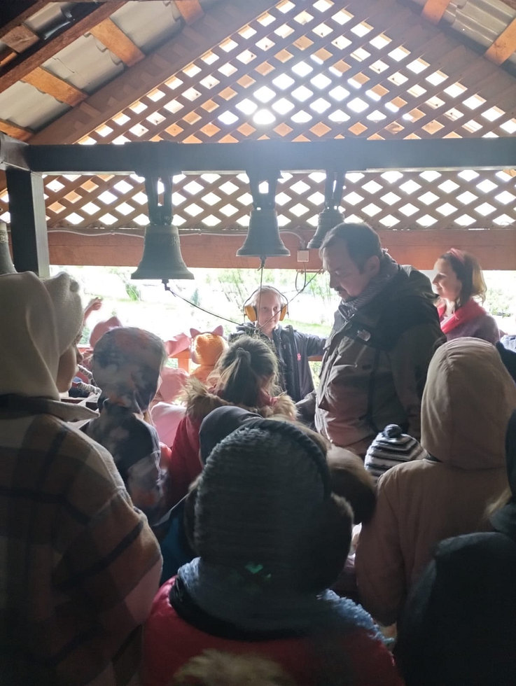 Там детей ждал главный звонарь храма и ведущий фестиваля Михаил Погорелов. Он рассказал ребятам об устройстве колокольни, об истории, технике и особенностях колокольного звона.