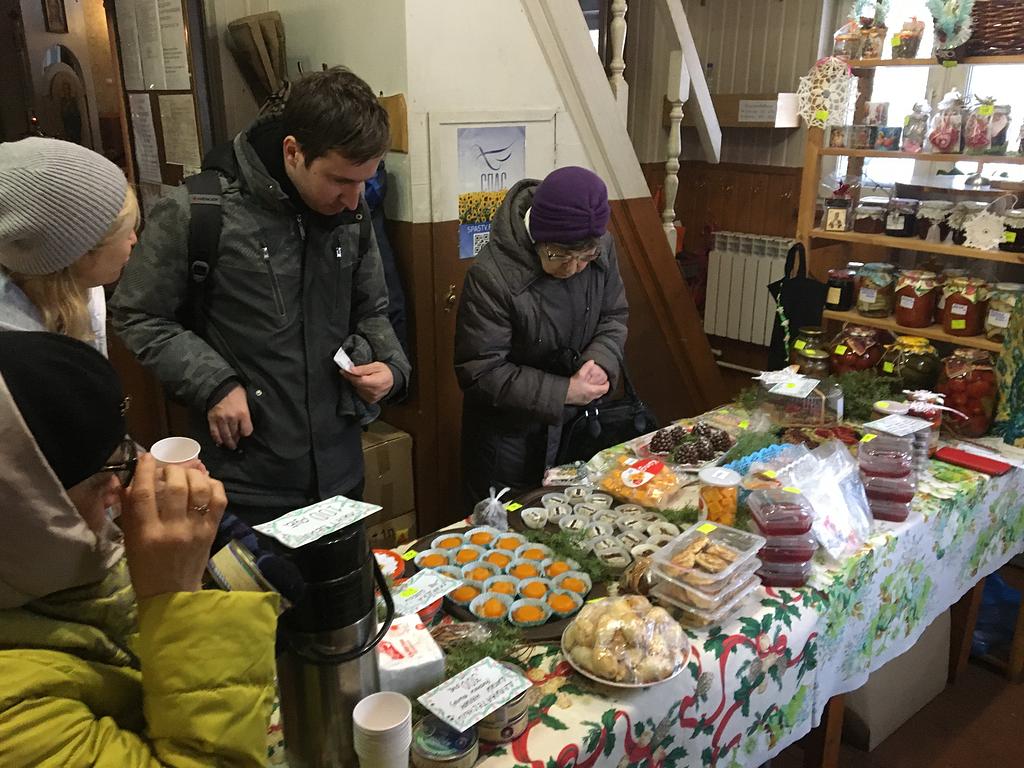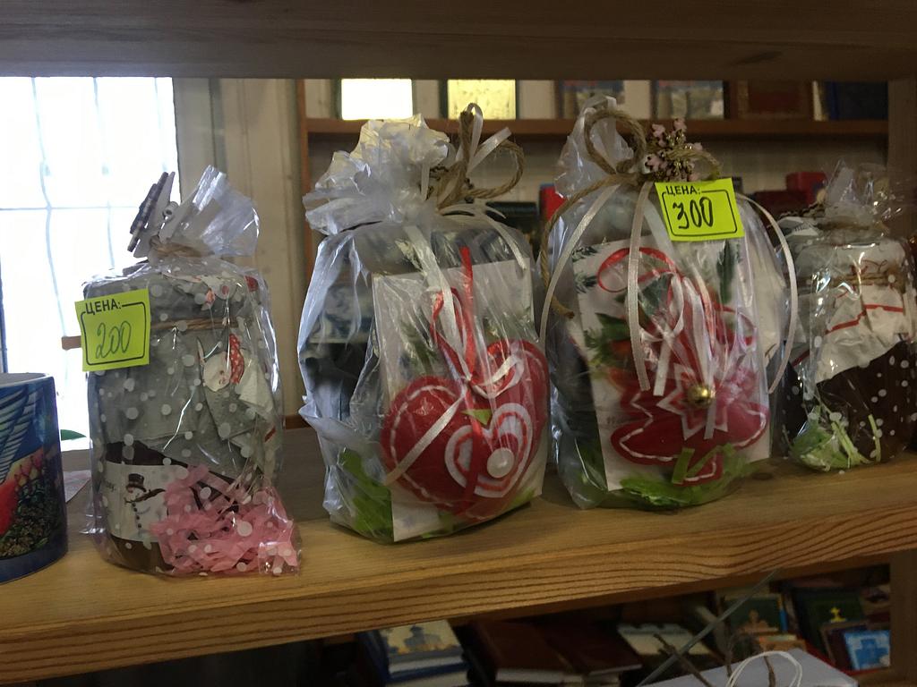 В продаже были представлены рождественские подарки, постные сладости ручной работы, выпечка, соления и прочие товары, изготовленные прихожанами храма и воспитанниками Воскресной школы.