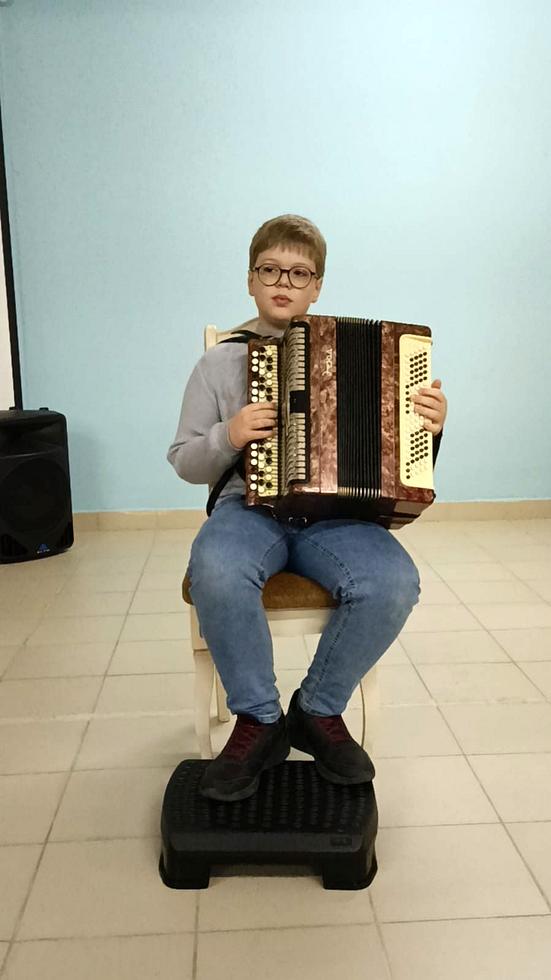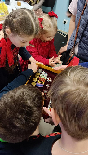 Концерт прошел в конференц-зале школы, украшенной портретами фронтовиков близких и родственников прихожан храма.